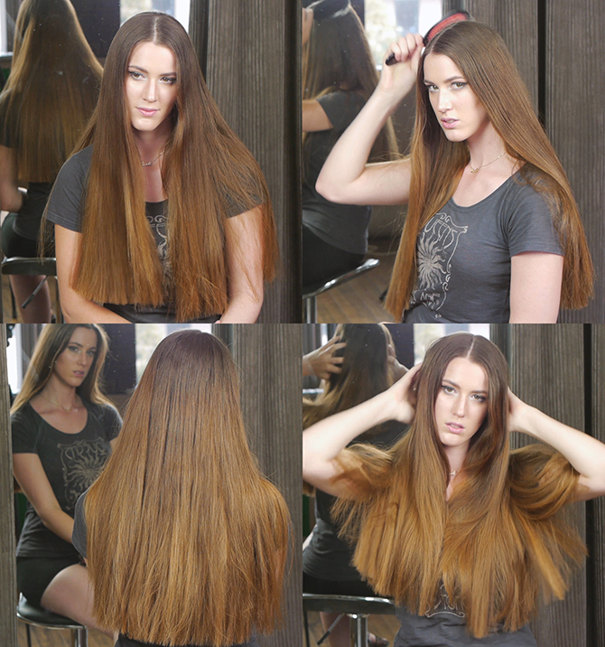 Jackie is a gorgeous model with thick brunette hair. Her waist length hair is freshly trimmed into a one length blunt cut ends.