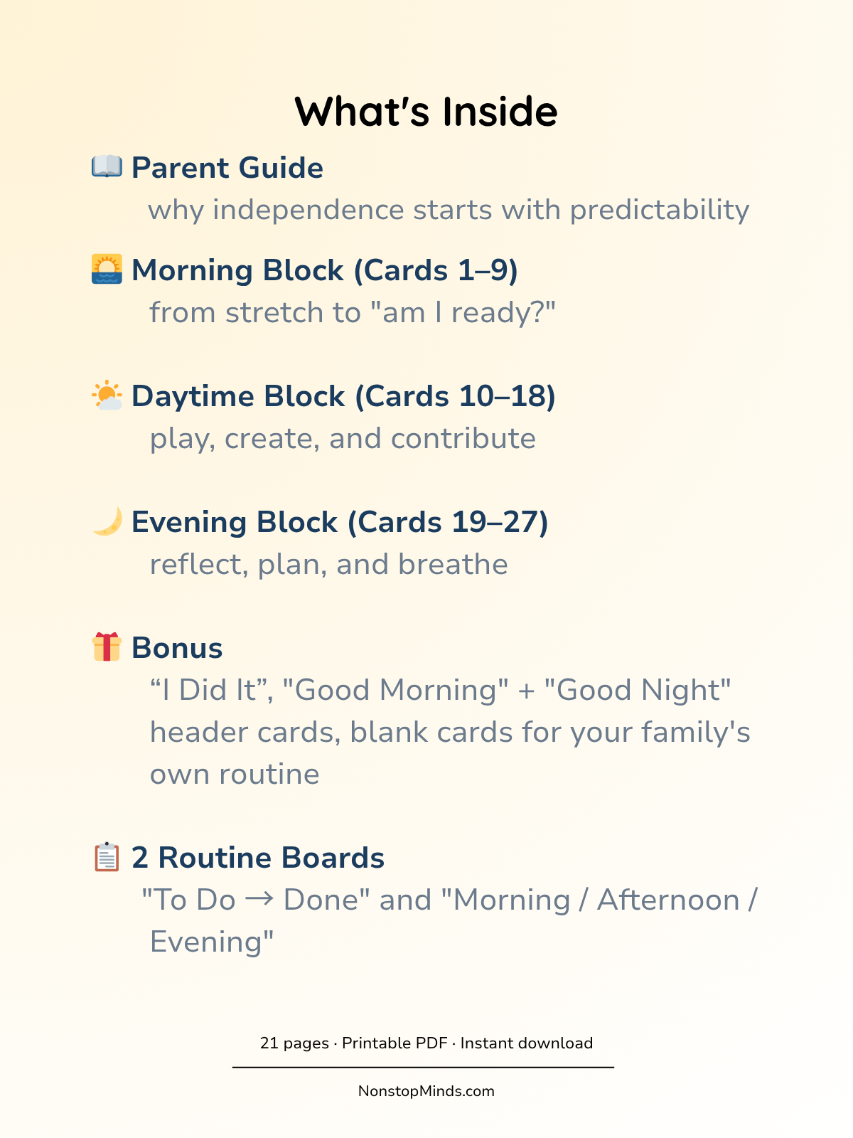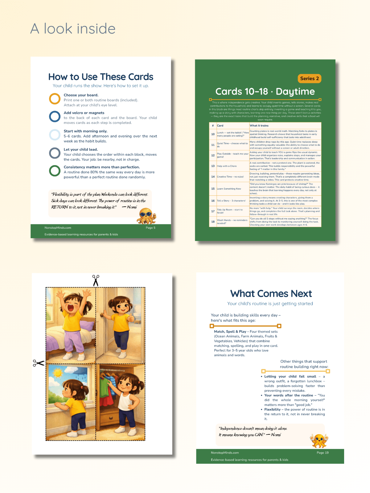 These 31 routine cards build real independence — from checking the weather and packing a backpack to reflecting on the day and preparing clothes for tomorrow. Each card targets a specific skill that research links to school readiness.