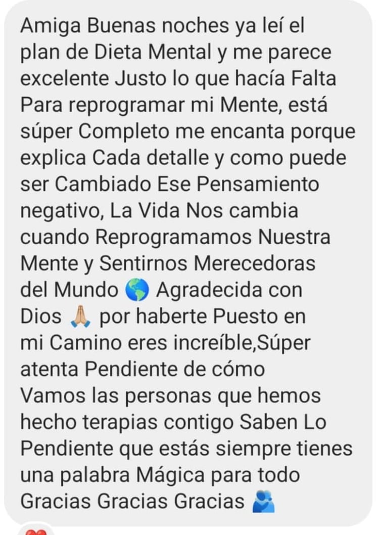- Reto de Dieta Mental: Una guía clara para sostener tu diálogo interno, reducir pensamientos de carencia y alinear tu mente con tu nueva realidad. PDF (Valor 20 USD)