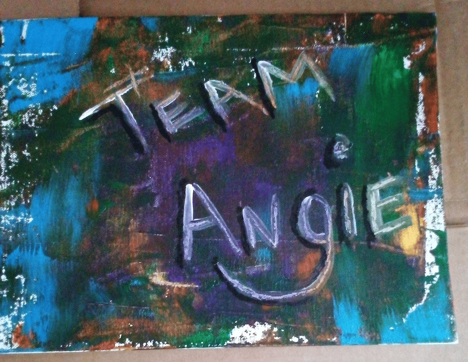 Join 'Angie's Crew' with this vibrant digital canvas. Featuring the words 'Team Angie' in a distinctive, textured style, this artwork is a fun and energetic way to express your support and connection.