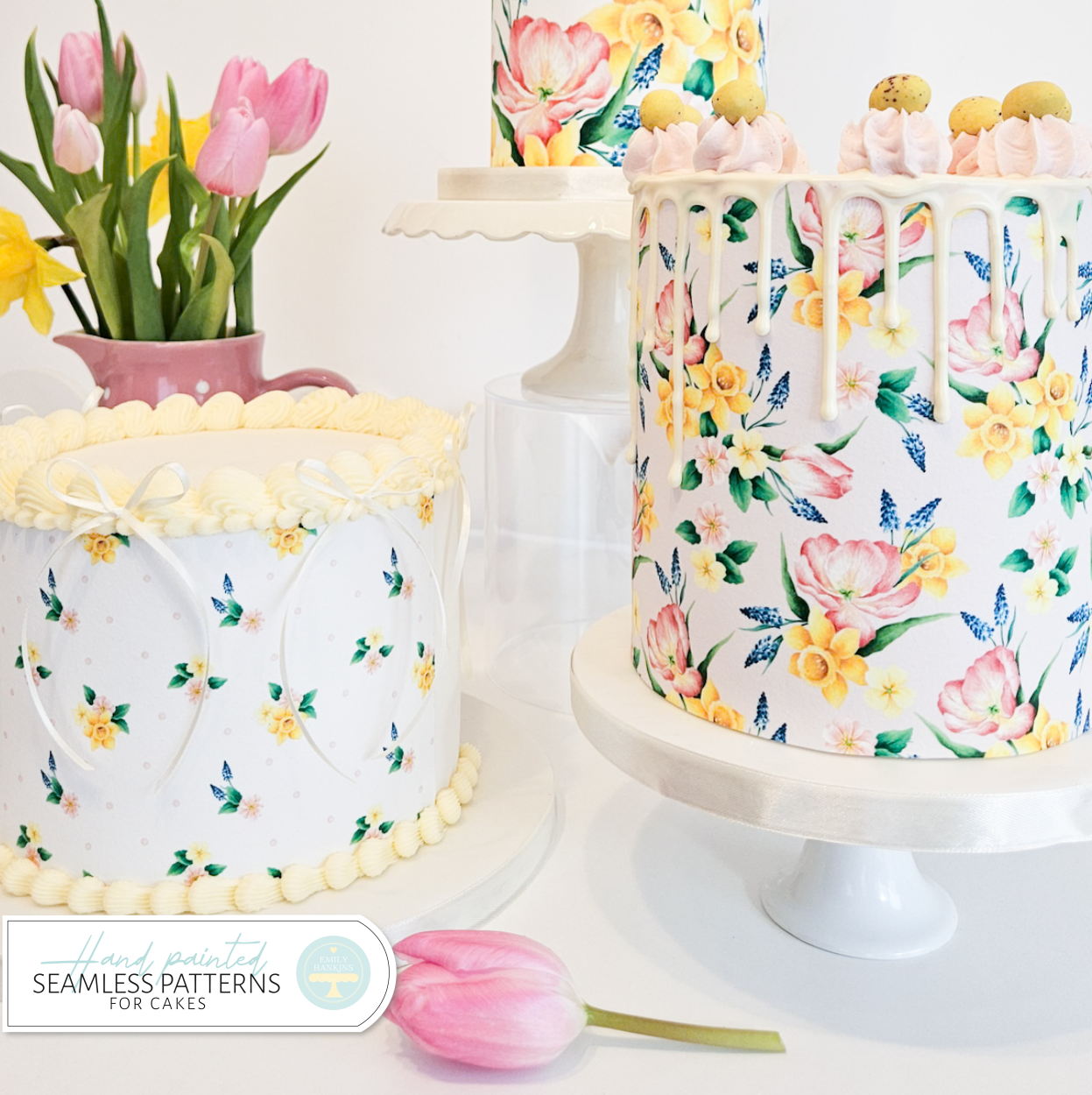 The design is inspired by my spring garden and features tulips, daffodils, muscari and primroses. This sheet design is a collection of individual flowers and flower clusters perfect for carefully cutting out and applying to your cake applique style! Each flower has been hand painted by Emily and painstakingly crafted into a seamless pattern for your cake designs.