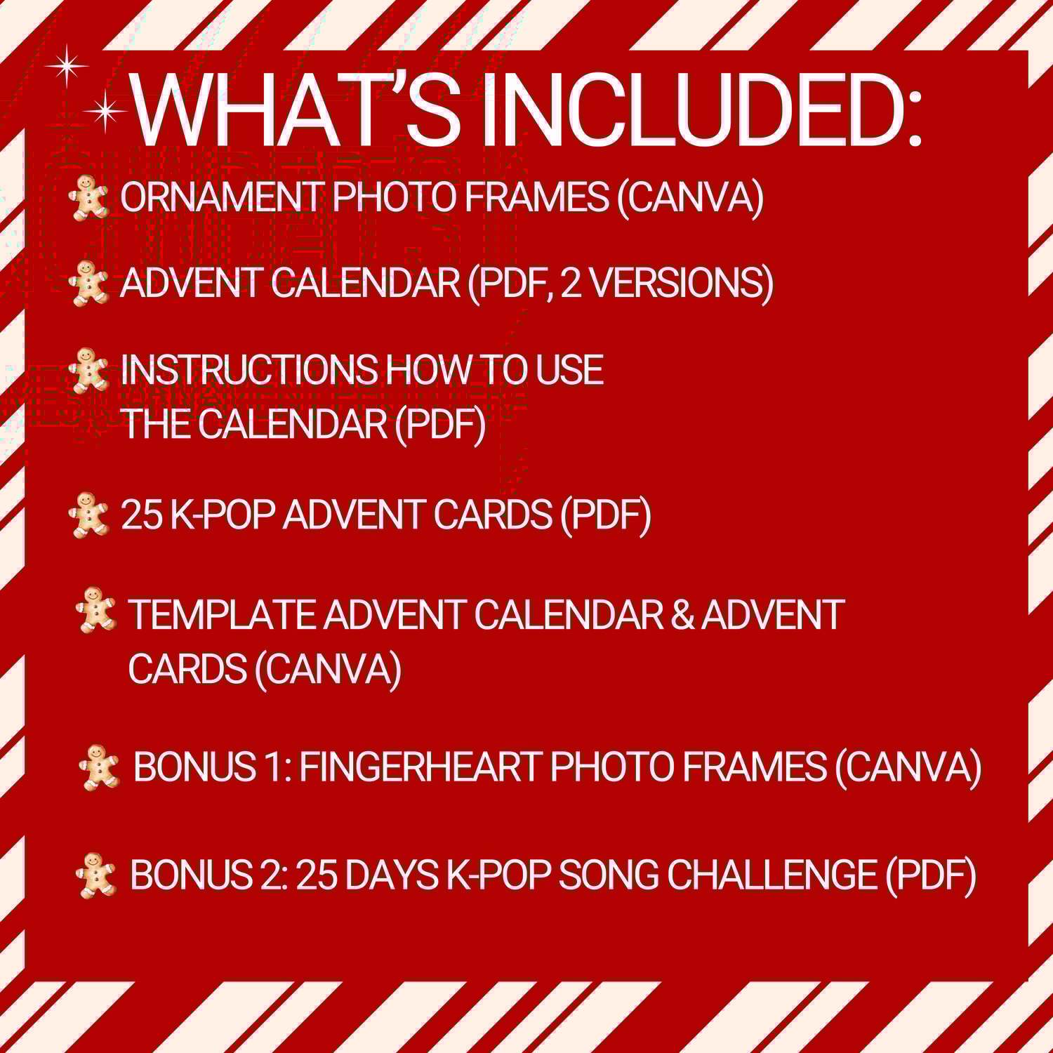 Make December magical with this adorable and interactive K-Pop Advent Calendar, designed for fans of all ages! Whether youโre celebrating with your ult, decorating your wall, or enjoying cozy winter nights with music and challenges, this printable bundle brings K-Pop joy to every day leading up to Christmas.
