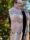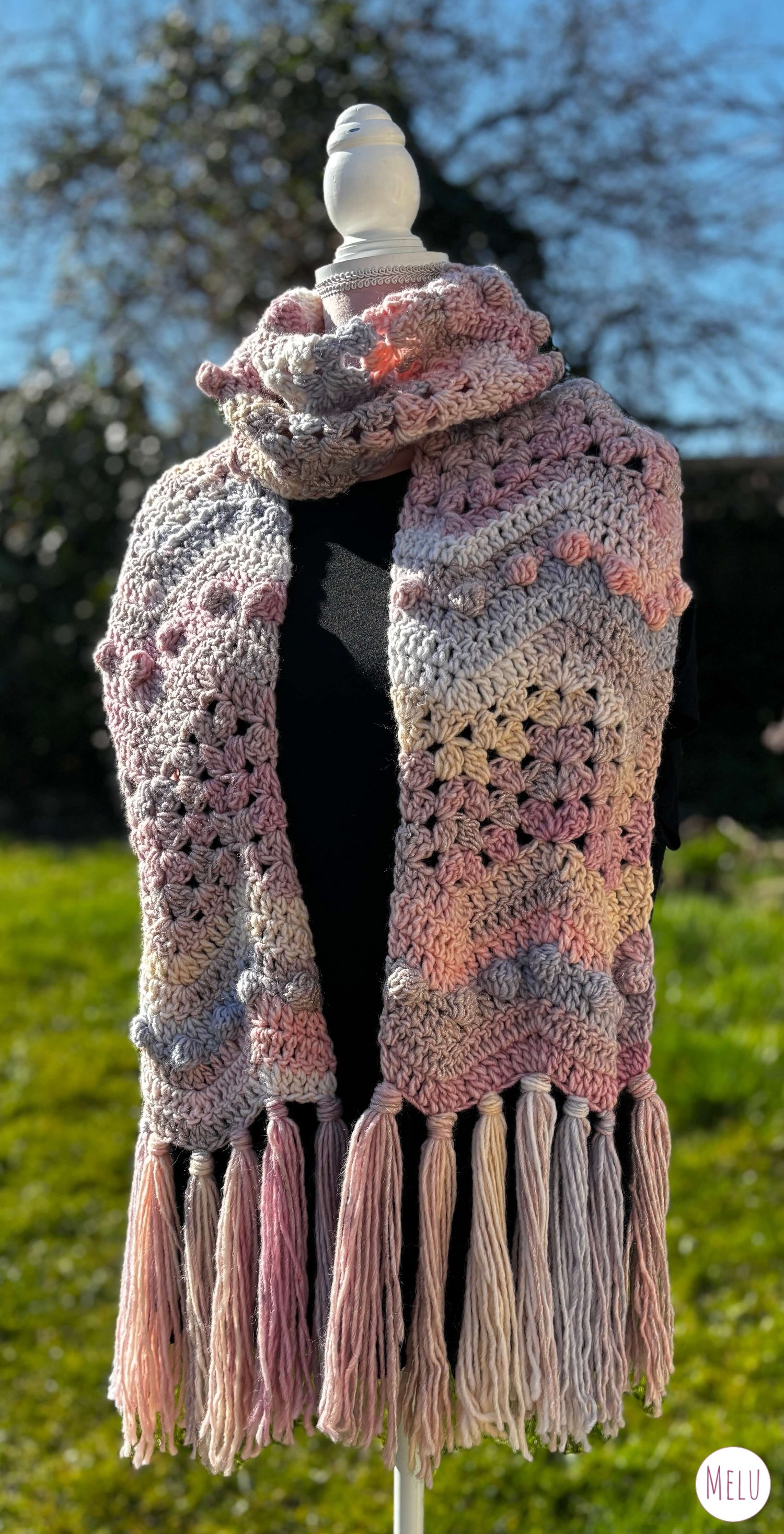 Crocheted in Mocktail colour-changing yarn, it drifts through dreamy pastels, soft blues, and silvery tones, catching the light beautifully.