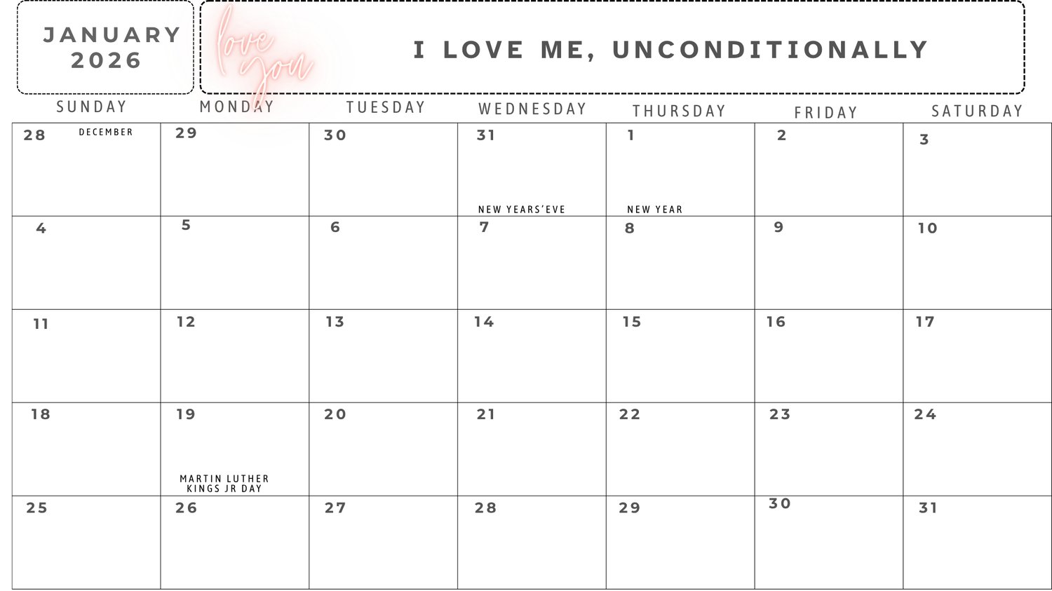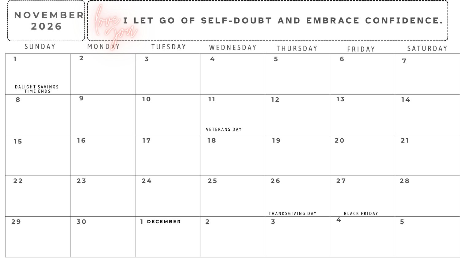 2026 Calendar Self Esteem Affirmations
