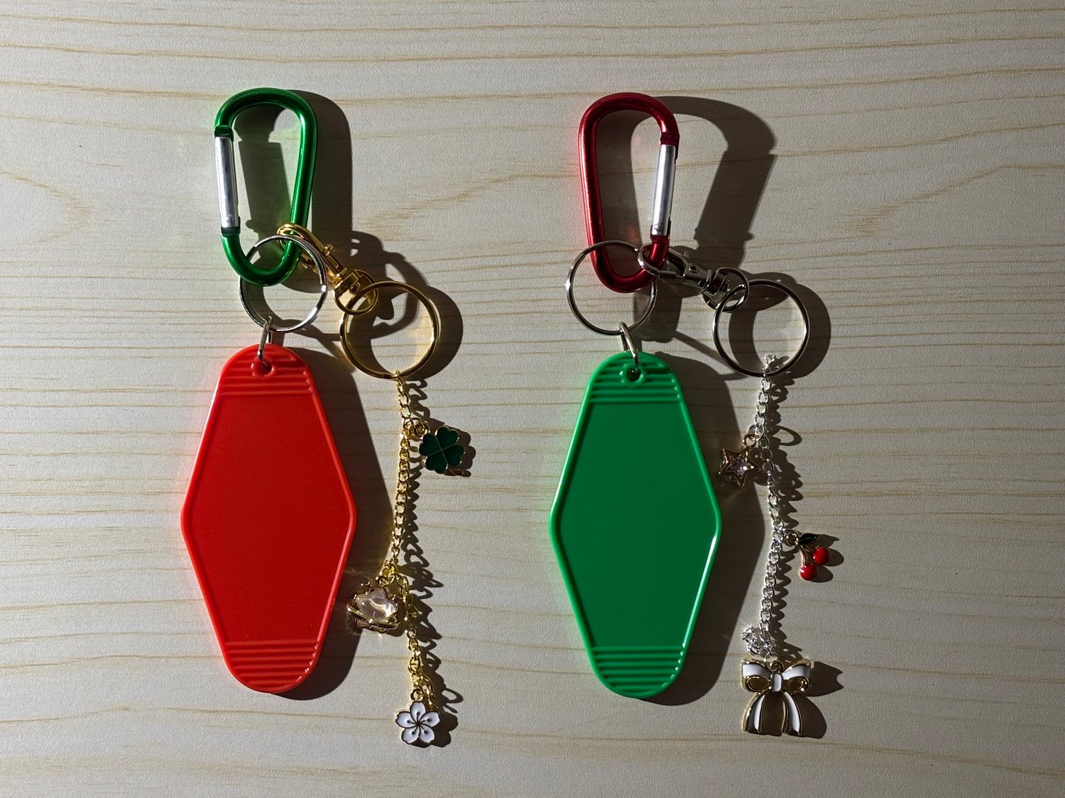 These are premade Christmas inspired Keychain Kits! You still will be getting everything you would get in a Basic DIY Keychain Kit which is, a motel keychain, d-shaped carabiner, silver or gold chain, 3 charms, and 3 stickers sheets with extra stickers but at such a low price!