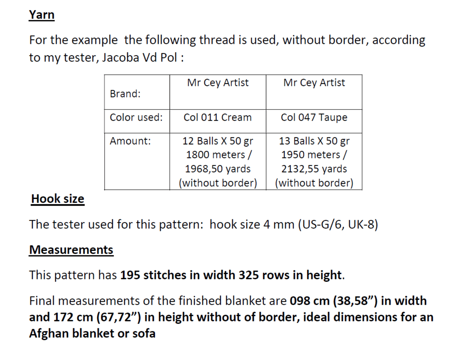 For this pattern, my tester Jacoba Vd Pol used a 4 mm hook (US-G/6, UK-8) and the measurements with the recommended yarn (Mr Cey Artist) were 098 cm (38,58”) in width and 172 cm (67,72”) in height without the border, ideal dimensions for an Afghan blanket or sofa