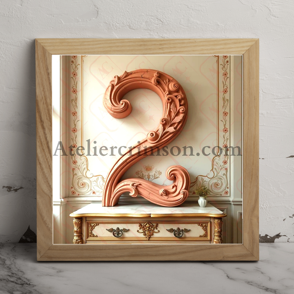 Number 2 terracotta Art Nouveau typeface inspired by Alphonse Mucha's with flowing lines and floral motifs, set against a soft, muted background with a gilded wooden dresser and subtle lighting effects.