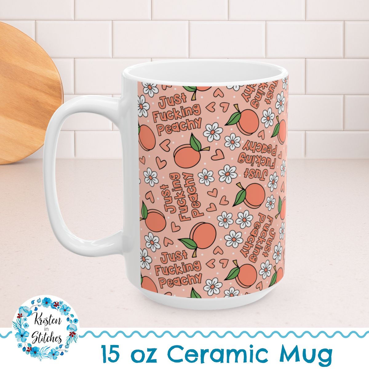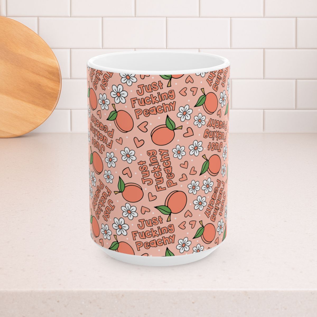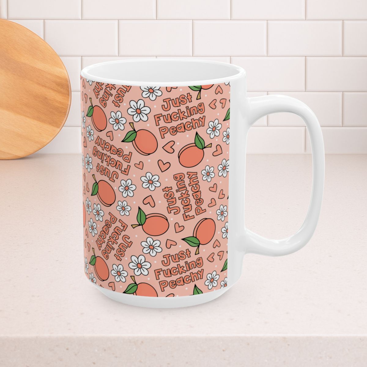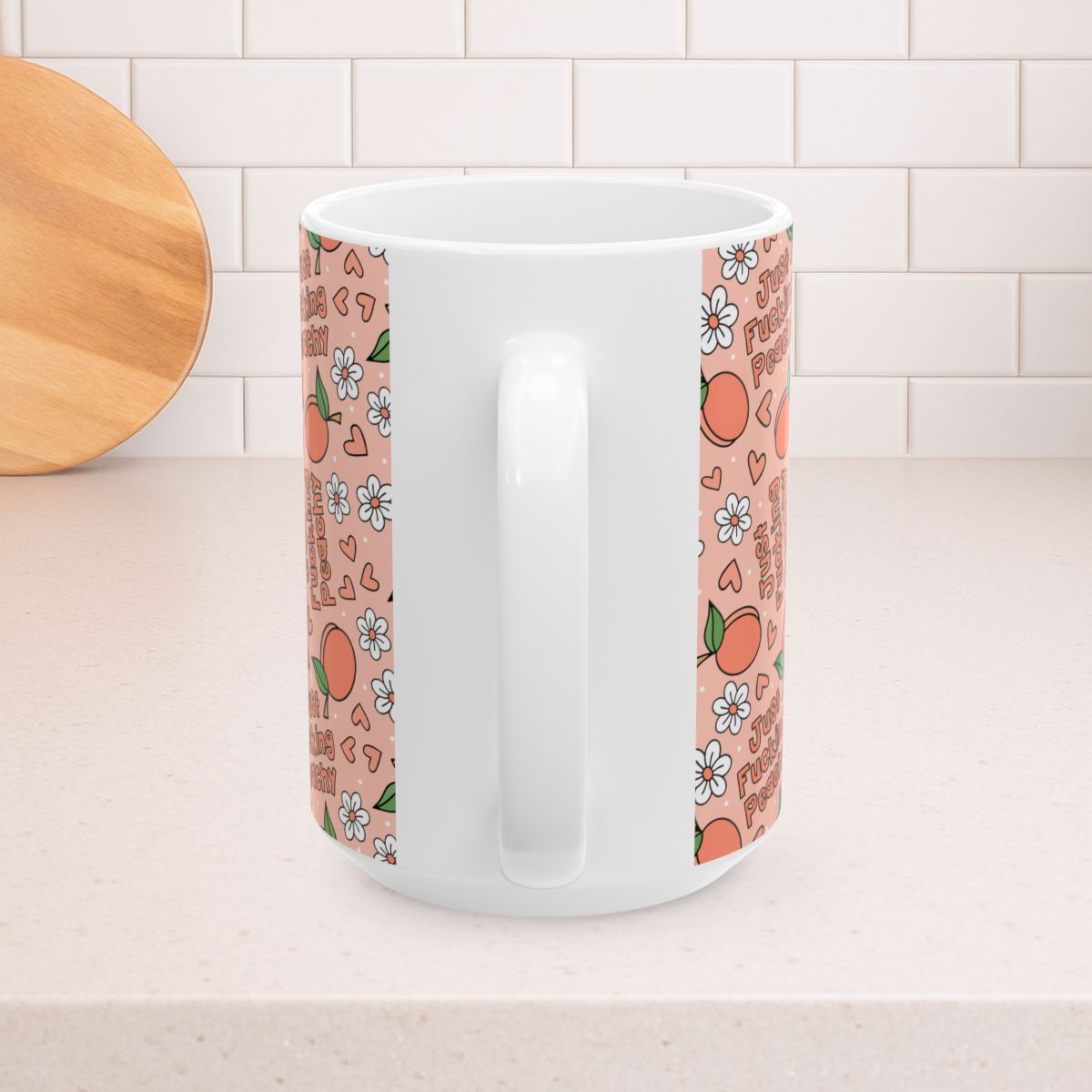 Just Fucking Peachy Floral 15oz Ceramic Mug, Large Coffee Cup, Swear Words, Pretty Profanities