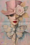 Transform your walls into a romantic gallery with this elegant AI-generated wall art. Featuring a stunning woman in a vintage-inspired pink hat adorned with a delicate rose and elegant leaves, her gaze captivates with bold red lips and piercing eyes. A soft butterfly-shaped bow gently wraps her neck, adding whimsical beauty to the piece. The soft pastel tones are finished with a magazine-style paper texture effect, giving the image a timeless, editorial charm that collectors and vintage art lovers will adore.