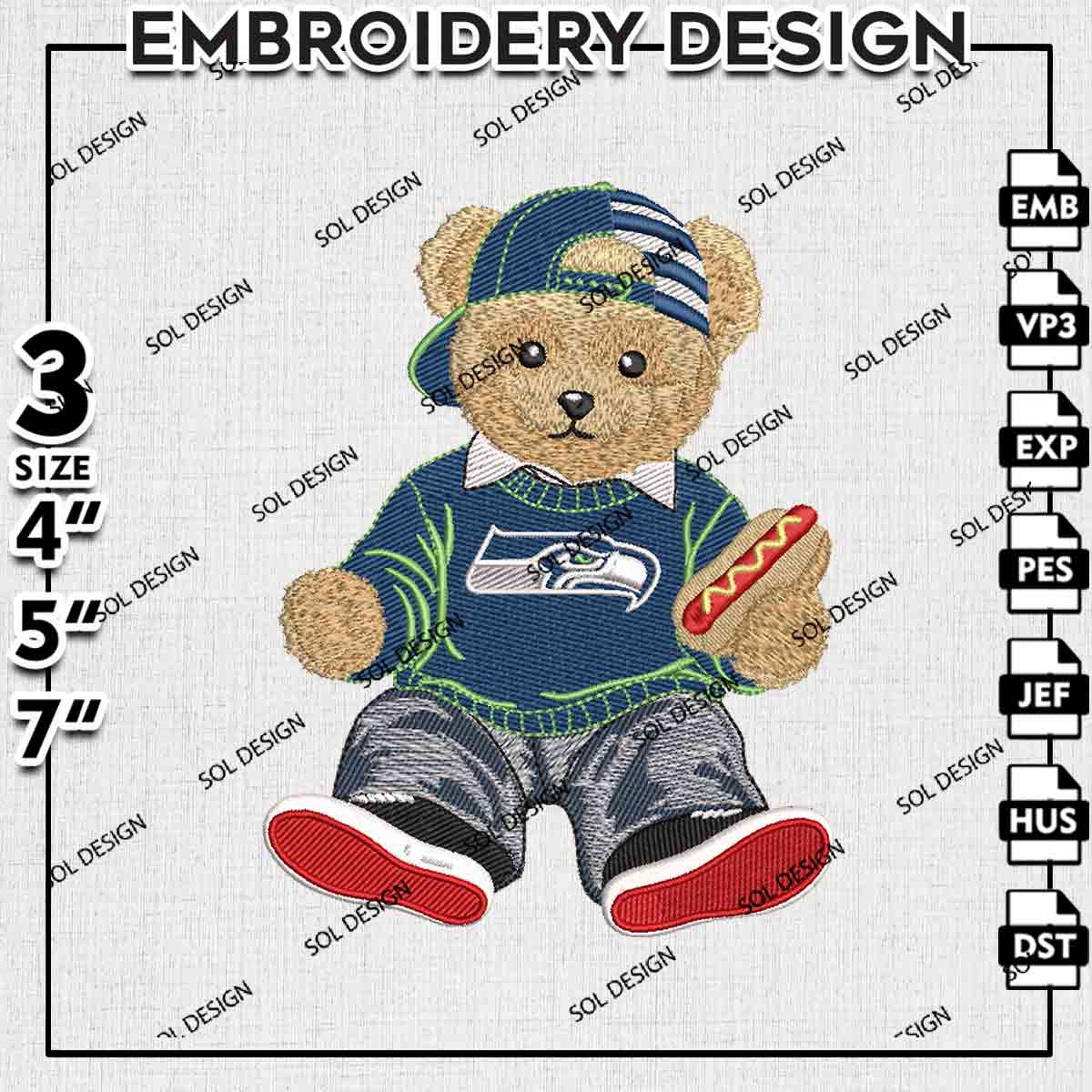 Seattle Seahawks Team Teddy Bear Holding Hotdog Logo Embroidery Designs, NFL Seattle Seahawks Embroidery Files, NFL Seahawks Logo Embroidery, National Football League Machine Embroidery Design, Cute Teddy Bear Sport Designs, Digital Do