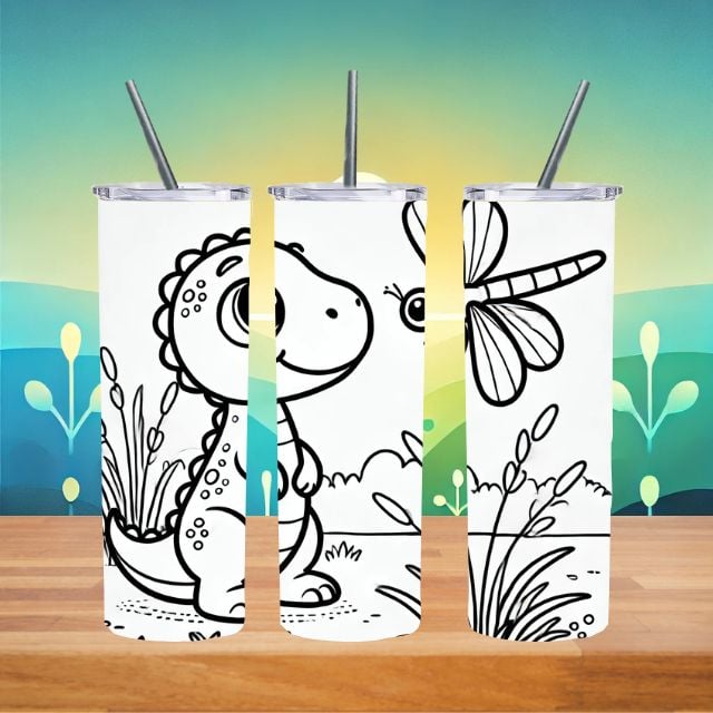 Unleash your creativity with this fun and interactive DIY coloring tumbler! Featuring a charming design of a dinosaur gazing at a dragonfly, this tumbler allows you to customize it with your favorite colors using washable markers. Once you're done, simply wash the tumbler to create a fresh canvas and color it again! Perfect for kids and adults alike, this tumbler is a delightful way to express your artistic side.
