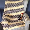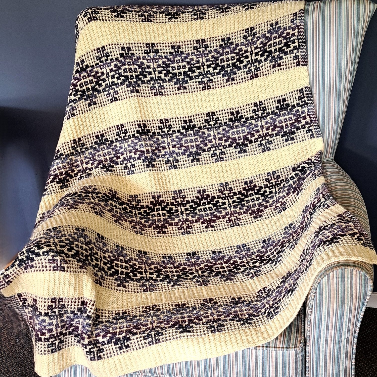 The blanket is worked in one piece in mosaic garter stitch panels alternated by the simple garter and slip stitch sections. The size is easily adjustable by making more or fewer repeats. The charts are also given in reversed colours for ease of use in case you decide to swap the light and dark colours in your blanket.