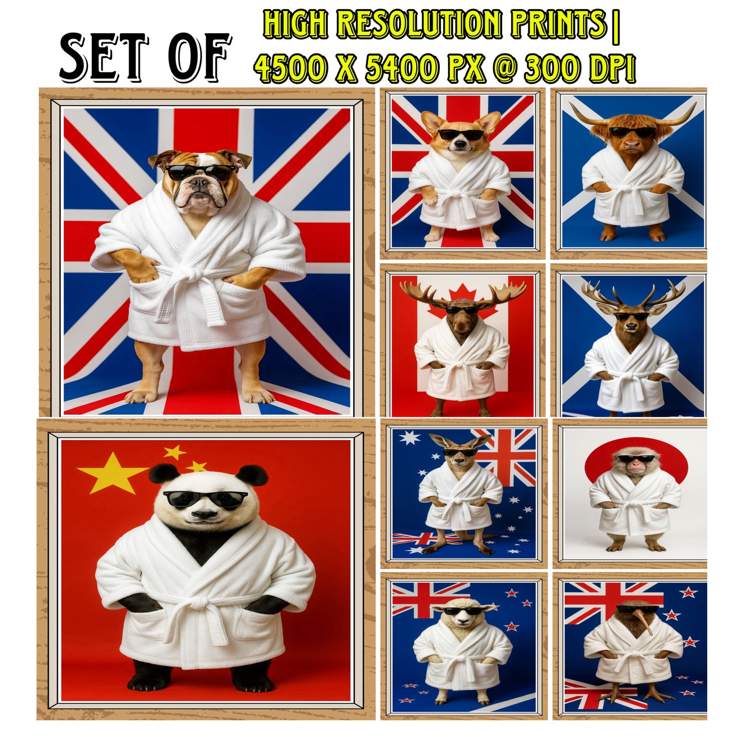 Bring joy and style to your walls with this set of high-resolution digital prints featuring unique animal portraits dressed in robes with iconic national backdrops.