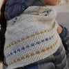 Materials used: 2 skeins of Iolair Yarn Easdale (70% Baby Alpaca, 20% Silk, 10% Cashmere; 225m (246yds)/ 100g); shown in colour howlite (C1), and 2 skeins of Iolair Yarn Easdale (70% Baby Alpaca, 20% Silk, 10% Cashmere; 45m (49yds)/ 20g, shown in colour wulfenite (C2) and sodalite (C3). Or use any DK yarn as substitute.