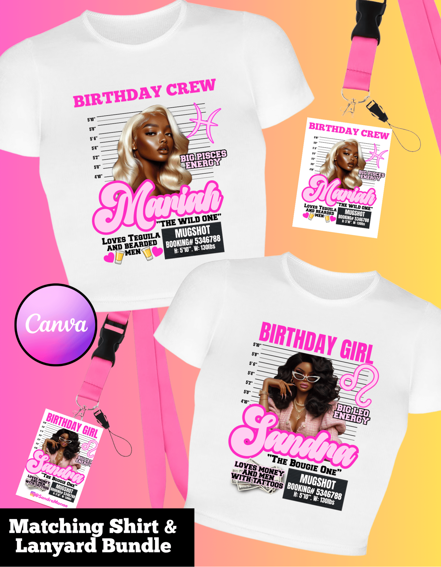 Round up the crew and celebrate in style with this hilarious and unforgettable Editable Birthday Crew Shirt & Lanyard Template Bundle! Designed in a fun mugshot theme, each template is fully customizable in Canva Pro so you can add your own photos, names, fun facts, charges (“Too Lit,” “Party Animal,” “Late to Everything,” etc.) and more!