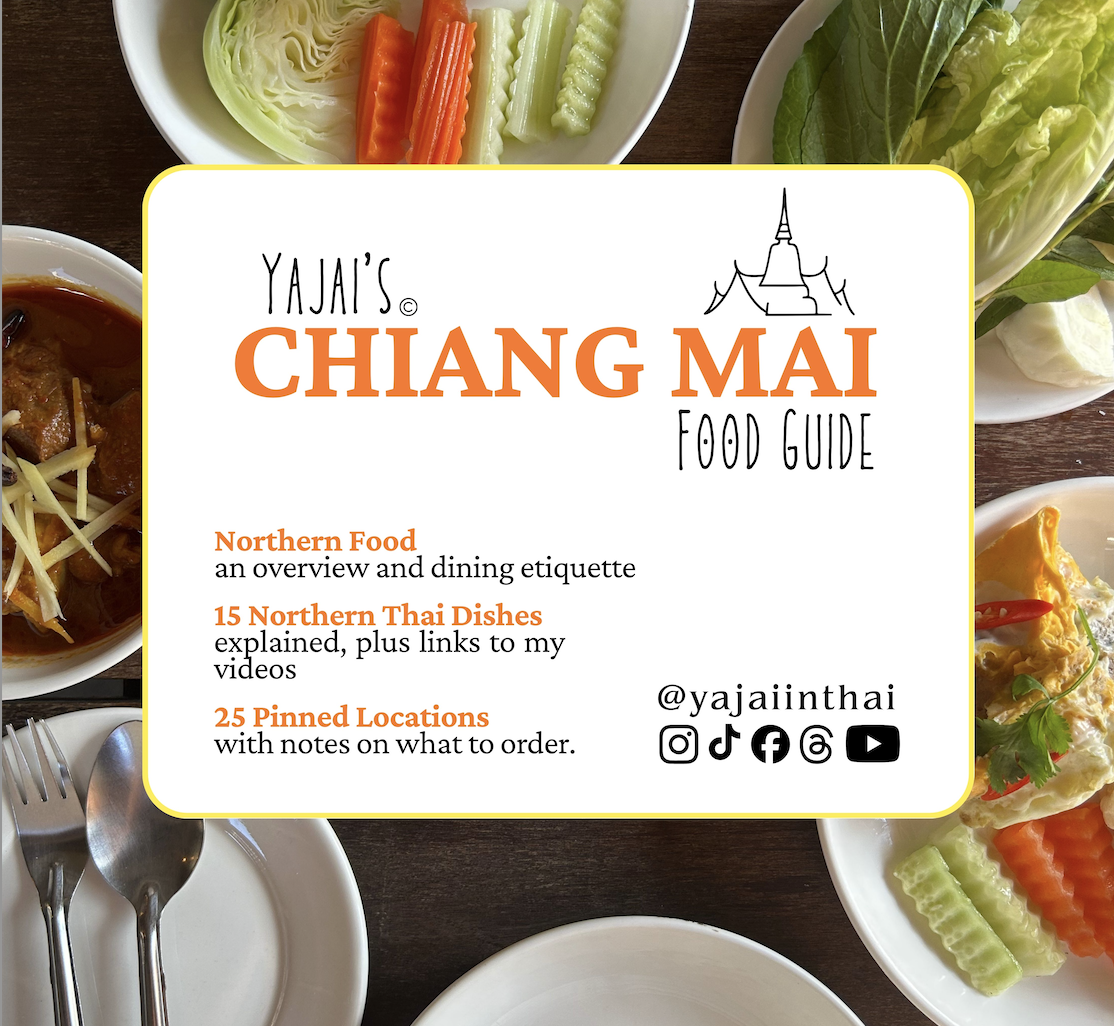 For each dish, there’s a brief explanation with a link to the corresponding video in my Northern Thai Food Series, a mini Thai lesson for easy ordering, and my recommendations for where to eat it in Chiang Mai.