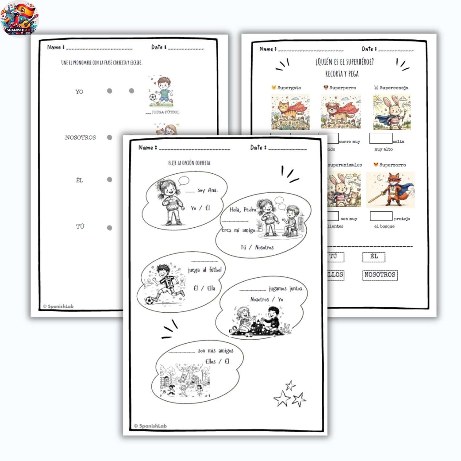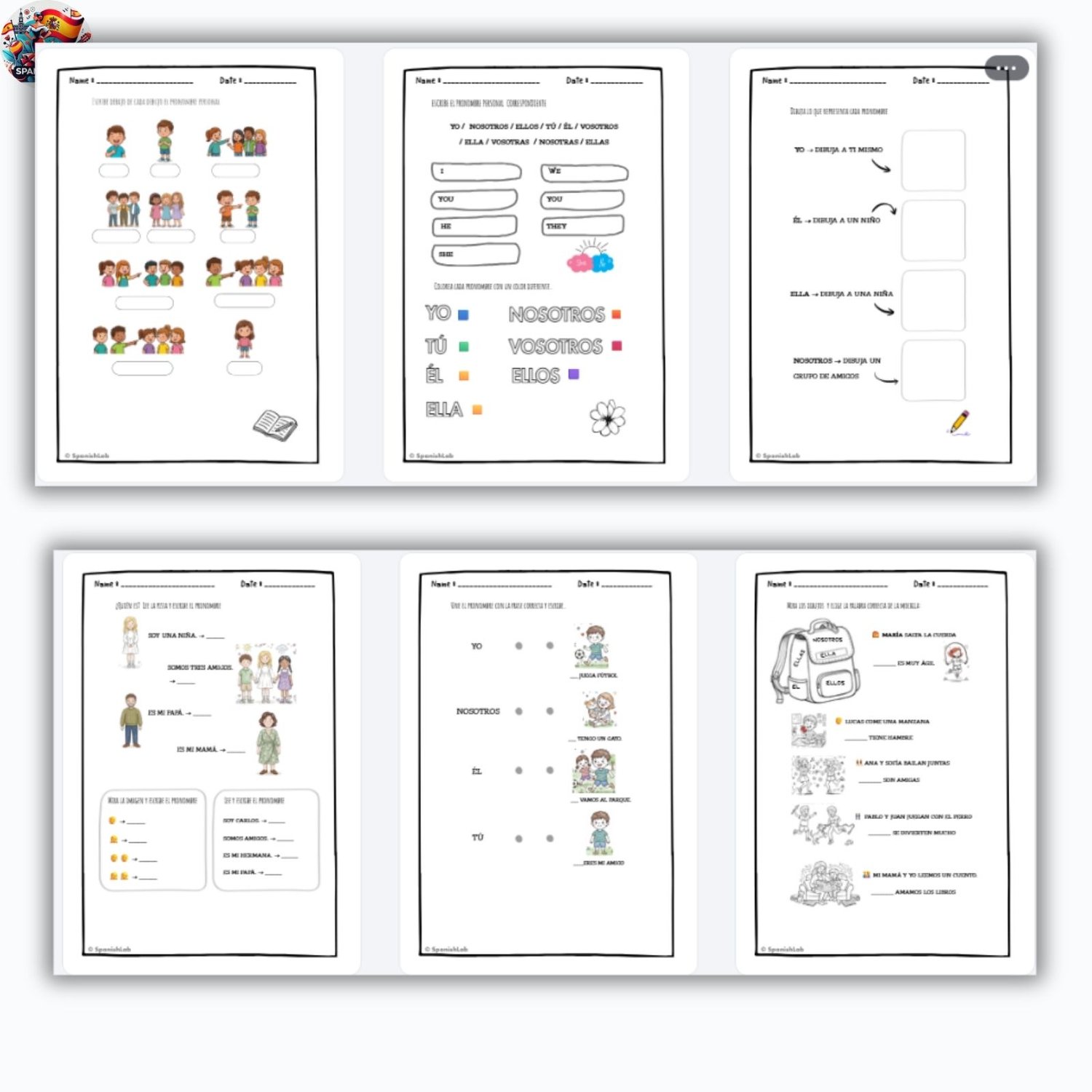 These worksheets are perfect for introducing and reinforcing Spanish grammar for beginners in a playful and accessible way.