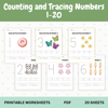 The worksheets incorporate pictures alongside the numbers, allowing children to practice counting as they trace.