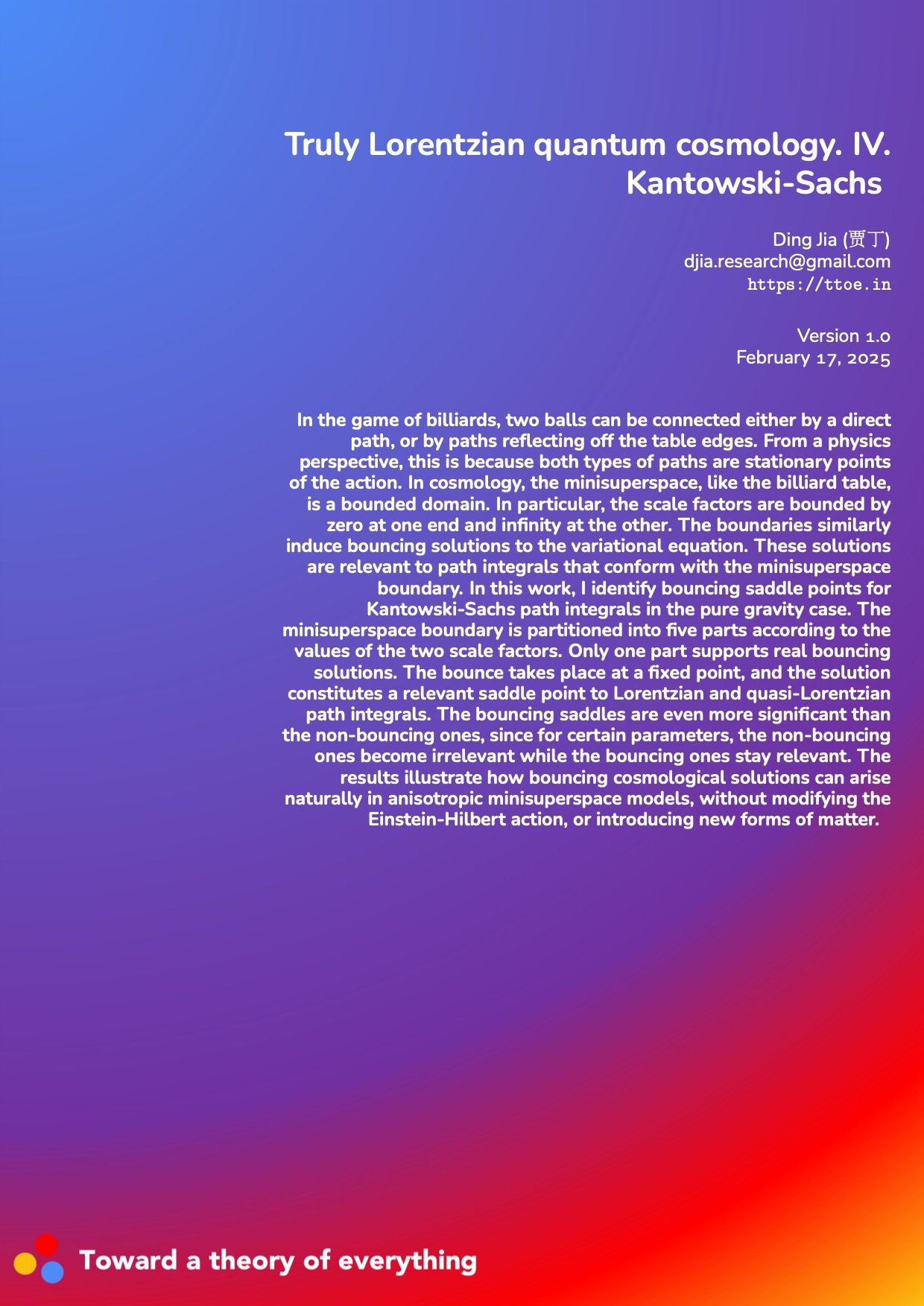 Abstract: In the game of billiards, two balls can be connected either by a direct path, or by paths reflecting off the table edges. From a physics perspective, this is because both types of paths are stationary points of the action. In cosmology, the minisuperspace, like the billiard table, is a bounded domain. In particular, the scale factors are bounded by zero at one end and infinity at the other. The boundaries similarly induce bouncing solutions to the variational equation. These solutions are relevant to path integrals that conform with the minisuperspace boundary. In this work, I identify bouncing saddle points for Kantowski-Sachs path integrals in the pure gravity case. The minisuperspace boundary is partitioned into five parts according to the values of the two scale factors. Only one part supports real bouncing solutions. The bounce takes place at a fixed point, and the solution constitutes a relevant saddle point to Lorentzian and quasi-Lorentzian path integrals. The bouncing saddles are even more significant than the non-bouncing ones, since for certain parameters, the non-bouncing ones become irrelevant while the bouncing ones stay relevant. The results illustrate how bouncing cosmological solutions can arise naturally in anisotropic minisuperspace models, without modifying the Einstein-Hilbert action, or introducing new forms of matter.
