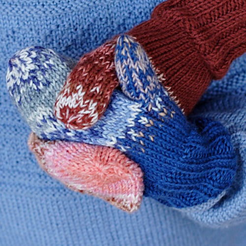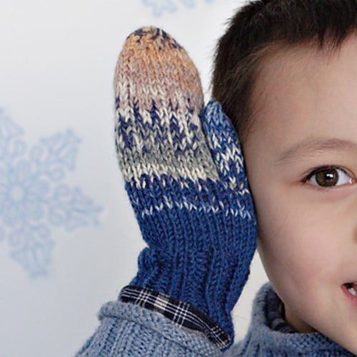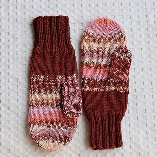 The yarn is held double for these mittens which makes them a quick knit even though you’re using a sock-weight yarn. Have some fun and play with the pattern repeat in the self-patterning yarn. Try to get the striping to match up or mix it up on purpose. Both look great.