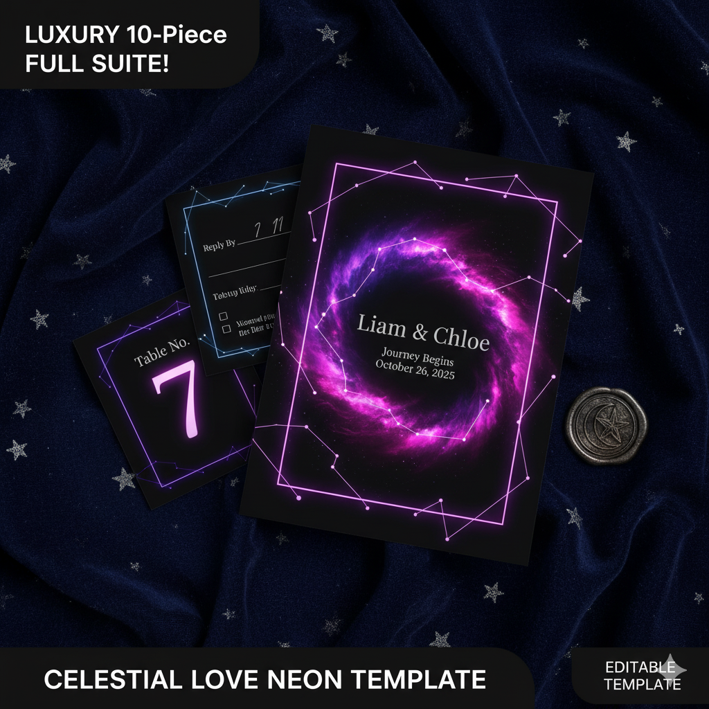 LUXURY Celestial Love 10-Piece Neon Wedding Suite | Starry Night Glow Theme | Editable Template