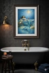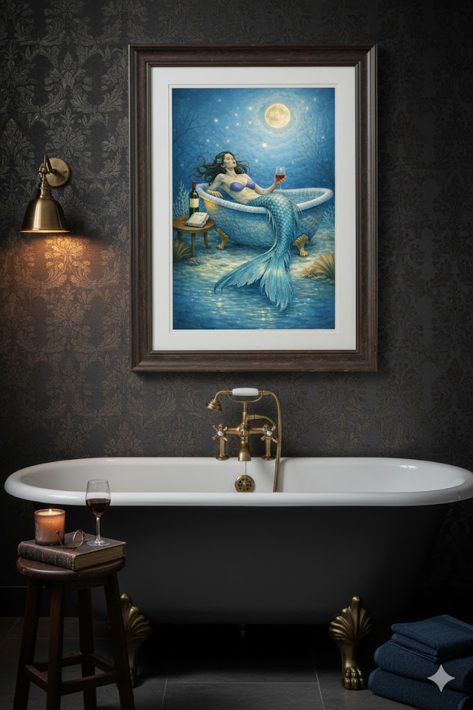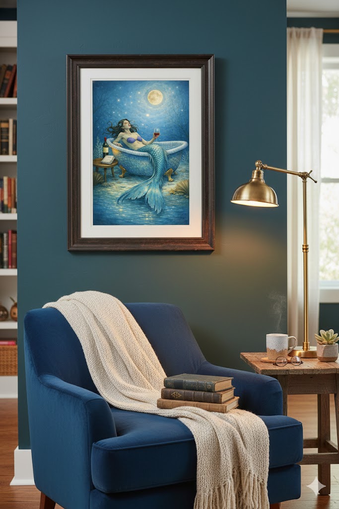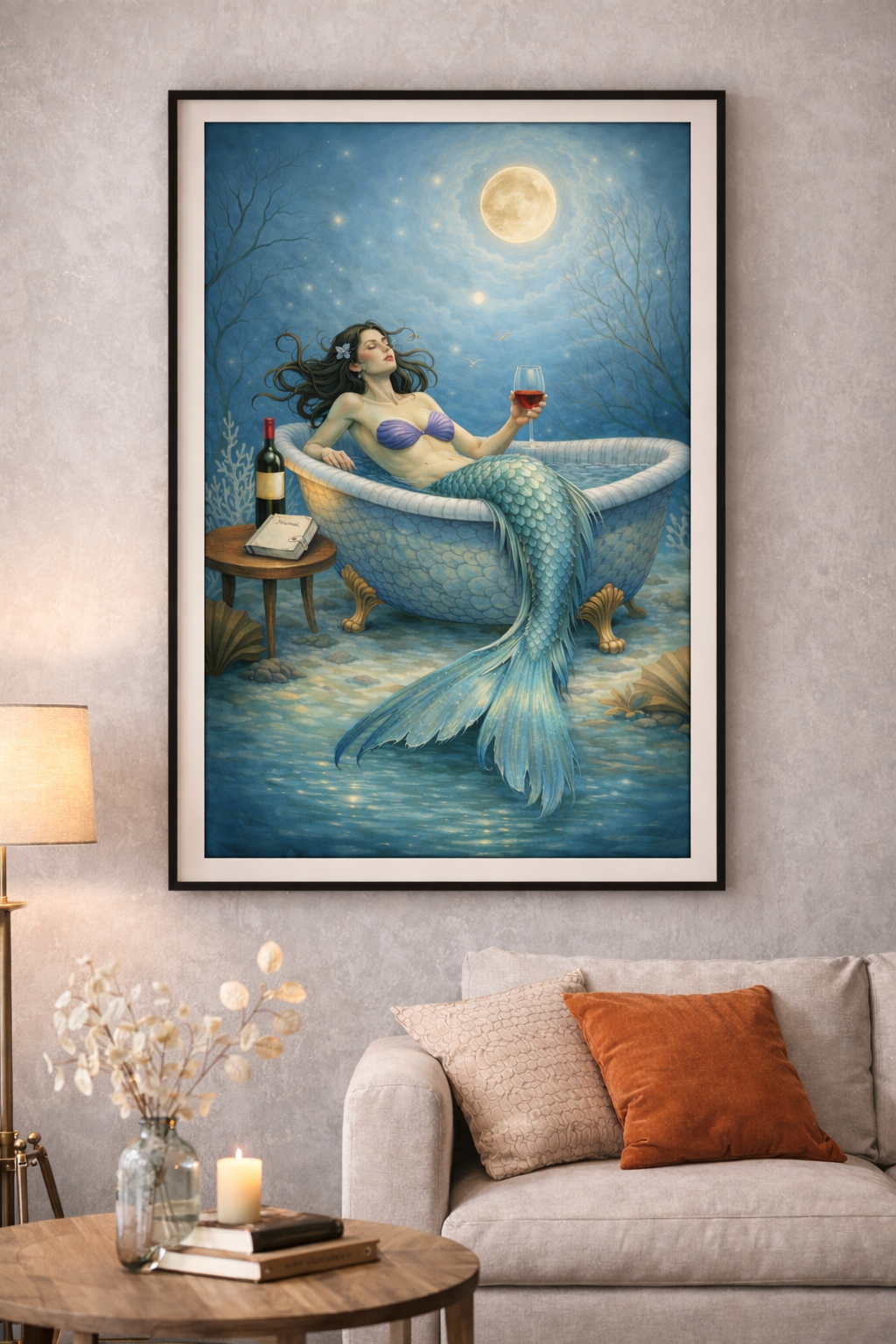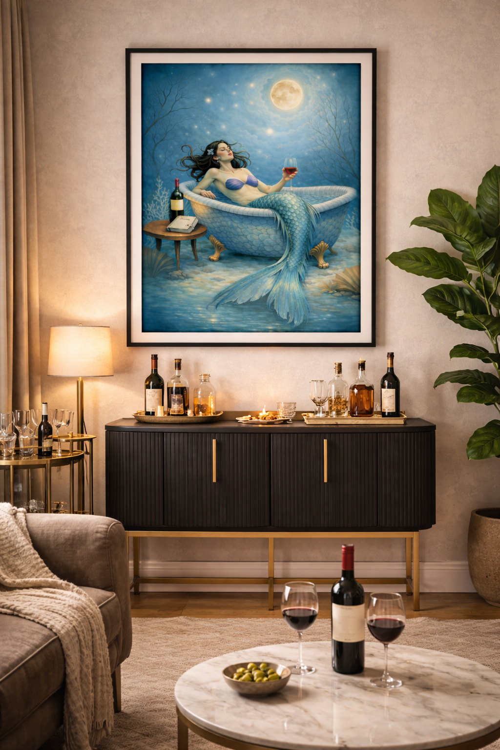 Indulge in the ultimate evening of relaxation with this whimsical, moody art piece. Featuring a serene mermaid enjoying a glass of wine and a good book under a glowing full moon, this print is the perfect addition to a cozy reading nook, a home bar, or an upscale bathroom.