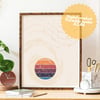 In a serene cosmic landscape, the vibrant celestial body with its colorful horizontal stripes of orange, red, purple, and blue floated gracefully against a light beige background. The subtle circular patterns and speckles resembling stars added a touch of space dust to the scene. This artistic depiction of space in a minimalistic modern design captured the essence of abstract celestial art, making it a perfect piece for those who appreciate contemporary space-themed decor. The unique blend of colors and simple yet profound design evoked a sense of tranquility and wonder, ideal for modern home interiors. This stylized representation of a planet was not just a visual delight but also a testament to the beauty of the cosmos.