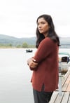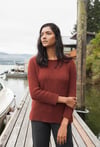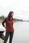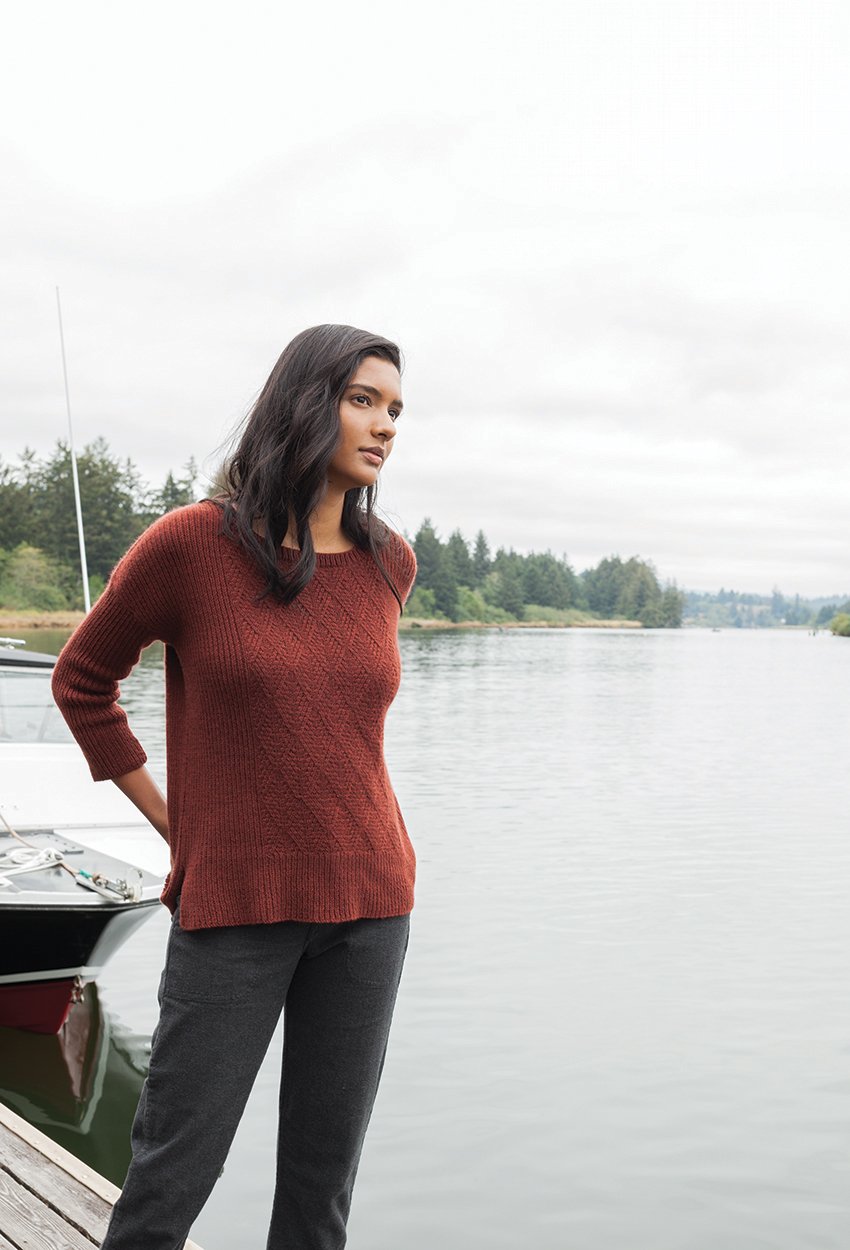Lightweight yarn works into an effortless, boxy pullover with flattering ¾ length sleeves. A beautiful central cable panel is flanked by ribbing and topped with a wide ballet neckline.