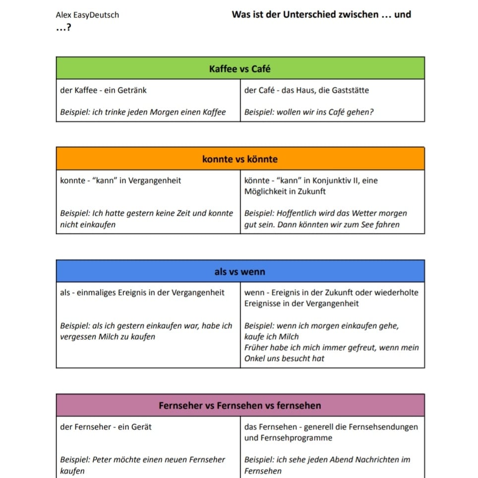 In this free file you will find the difference between more than 50 German pairs of words. Those words sound very similar, can be easily mixed up, but they often have completely different meanings.