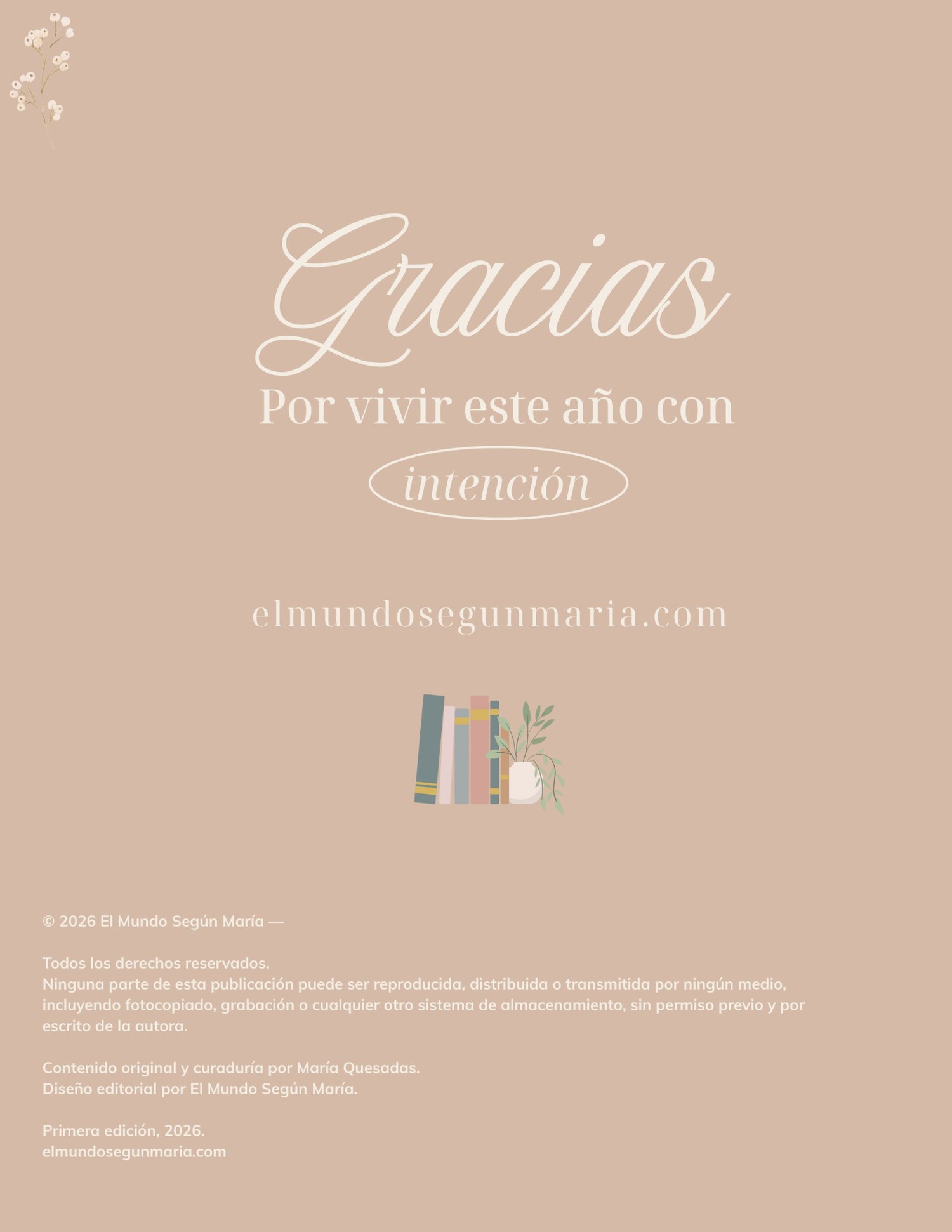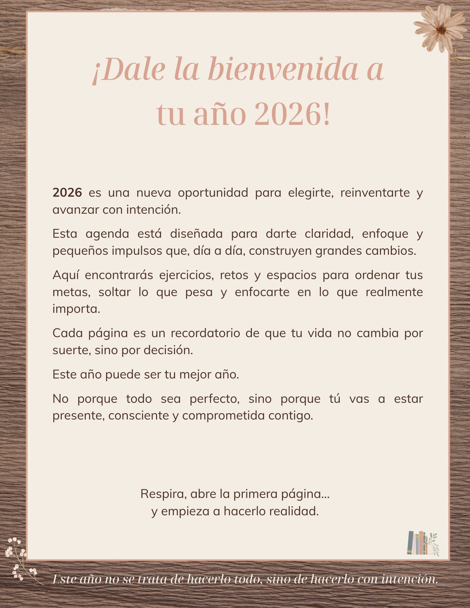 La Agenda 2026 de El Mundo Según María te acompaña a organizar tu año con intención, conciencia y calma. Incluye planeación mensual y semanal, retos, mantras, frases inspiradoras, actividades diarias de alto impacto y páginas de escritura libre para reflexionar, soltar y avanzar.
