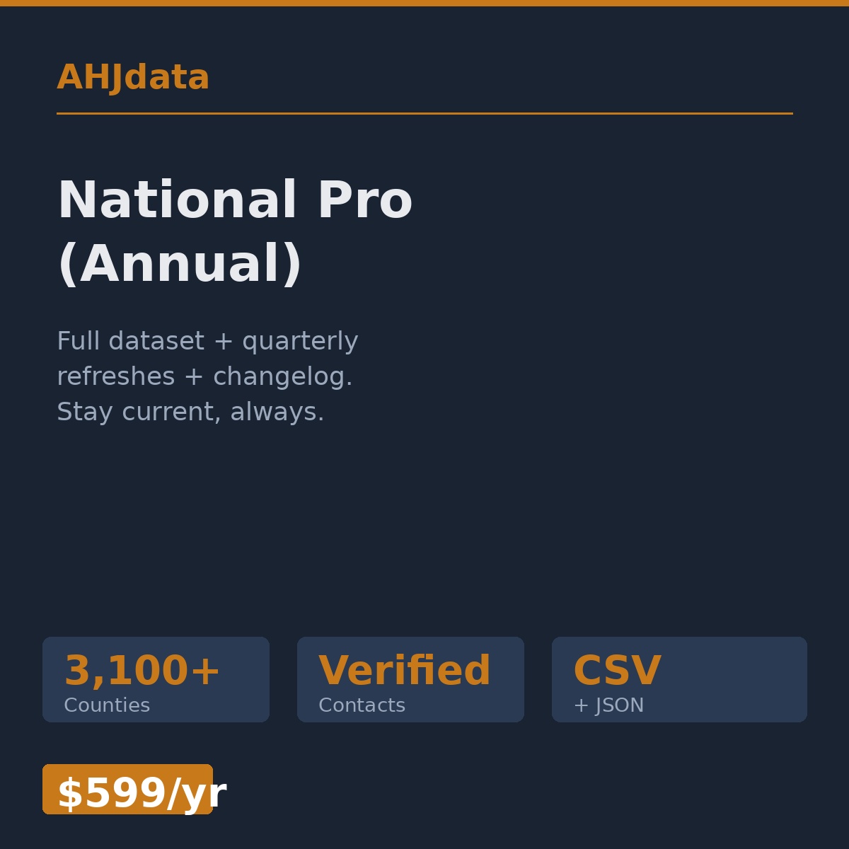 Full US coverage (3,100+ counties) with quarterly data refreshes. Every update includes a changelog showing new contacts, updated fees, and changed submission requirements. Permit office contacts have ~30% annual turnover — stay current. CSV + JSON format. 30-day money-back guarantee.