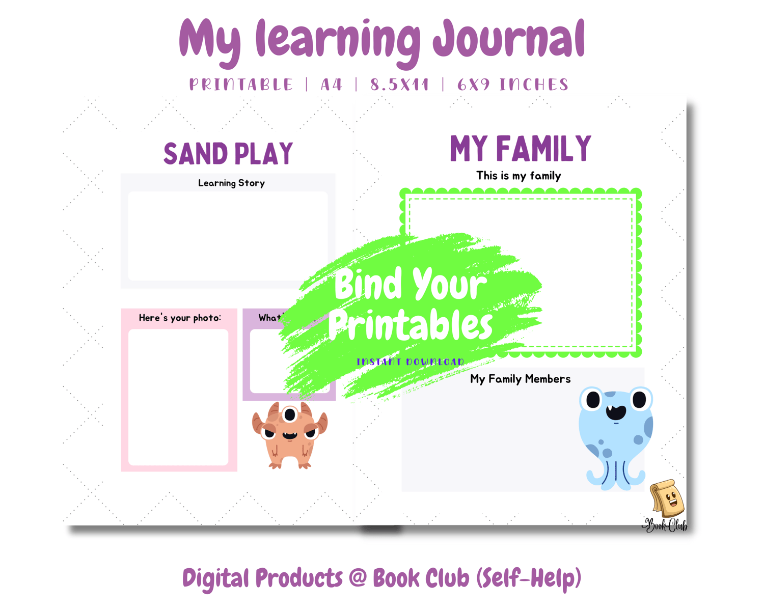 This dynamic learning journal is a treasure trove for preschoolers, covering a range of activities and self-exploration. From self-portraits to exploring family dynamics, handprints, footprints, and voice exploration, it's an adventure in self-discovery! Simple to print and bind all pages together with a stunning cover.