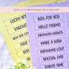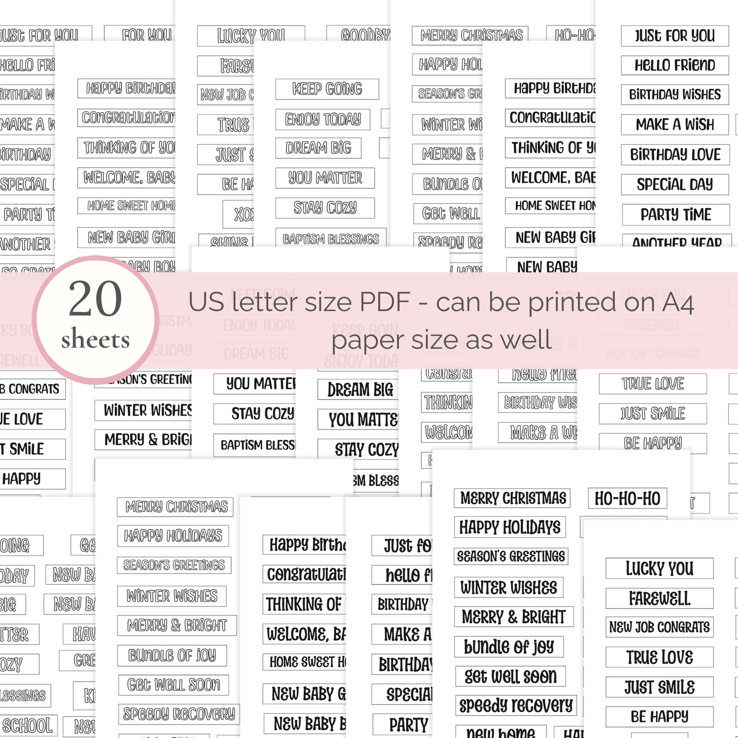 Ready-to-print PDF file with 20 sheets with 90 different sentiments for cards and crafts, arranged this way: