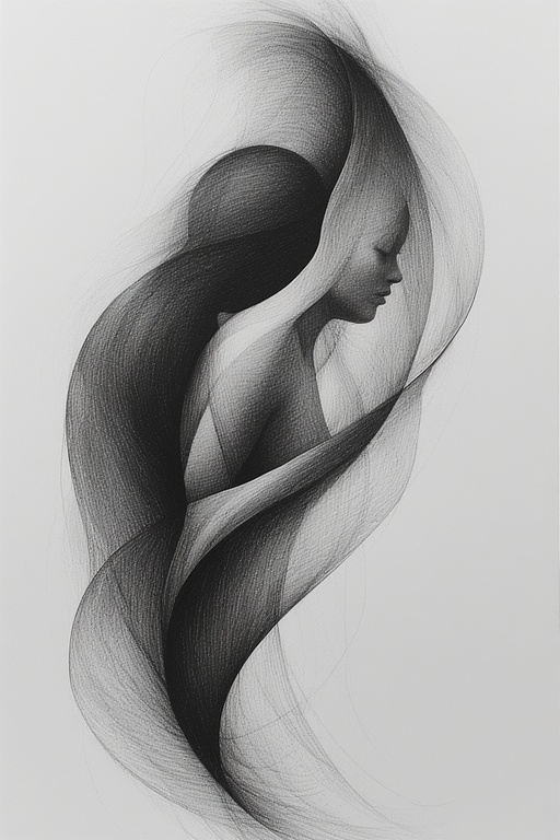 This captivating monochrome digital drawing presents an abstract feminine silhouette enveloped in swirling, ethereal lines that suggest flowing hair and veiled fabric. The graceful profile emerges softly from intricate hatching and gradients, evoking mystery, serenity, and timeless beauty. The minimalist composition with delicate shading and fluid motion creates a sense of quiet elegance and introspection. Perfect as a refined, contemporary statement piece for living rooms, bedrooms, or meditation spaces seeking premium abstract wall art that celebrates feminine essence in a subtle, artistic manner.