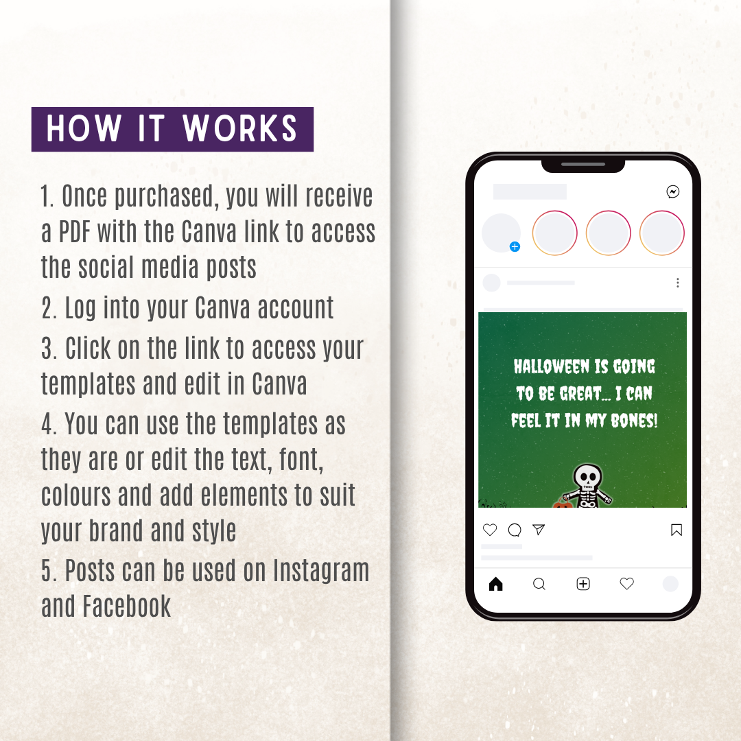 Perfect for coaches, virtual assistants, social media managers, and any small business owner wanting to add a unique Halloween twist to their social media content.