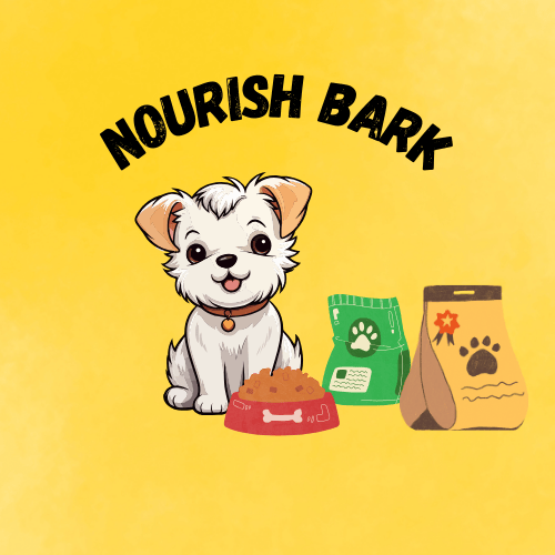 This logo for a dog food brand features a cheerful yellow background, symbolizing energy, warmth, and happiness, qualities every healthy and nourished dog exudes. At the center sits a playful dog in a petting position, capturing trust and care. Flanking the dog are two bags of dog food, reinforcing the brand's purpose and focus. Bold letters spelling out “Nourish Bark” stand prominently, reflecting strength, reliability, and the promise of premium nourishment for pets. The overall design is vibrant and inviting, appealing to pet owners seeking quality and love for their furry friends.