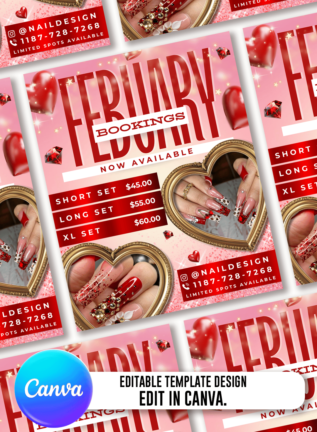Promote your Valentine’s nail services with this eye-catching, editable Canva template designed specifically for nail technicians who want to look professional and attract more bookings — without hiring a designer.