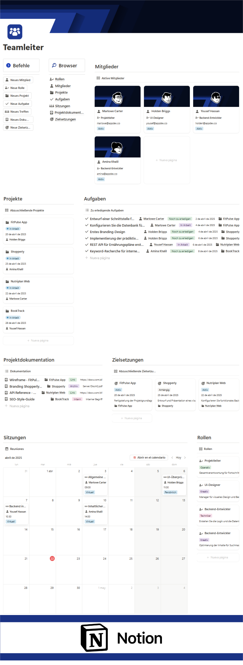 Mit diesem Template kannst du dein Team effizient verwalten. Behalte Rollen, Projekte, Aufgaben und Meetings im Griff und zentralisiere alle relevanten Dokumente, um die Zusammenarbeit zu erleichtern.