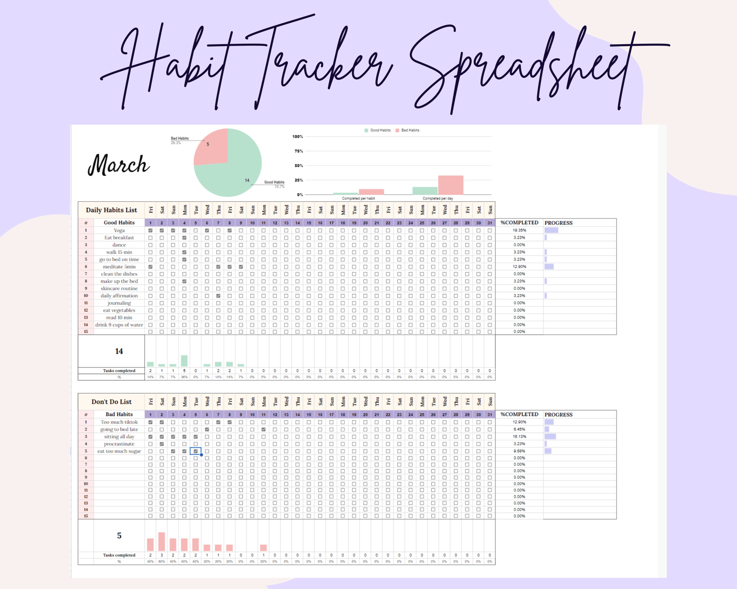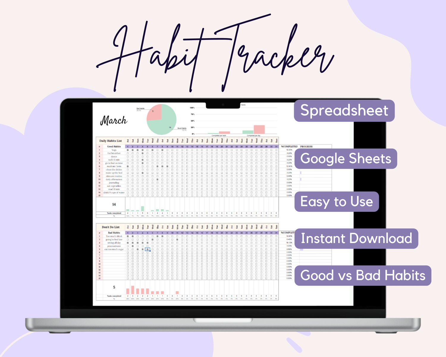 With this easy-to-use, Google Sheets spreadsheet, you can seamlessly track both your good habits and bad ones, helping you make informed decisions about your daily routine. The habit tracker is designed to let you identify patterns, understand their impact, and set achievable monthly goals. Whether it's a 'don't do list' or a 'must-do list', this tracker can handle it all. The unique feature of our habit tracker is the ability to compare your good and bad habits side by side, giving you a clear overview of your progress per habit and per day. Plus, with the interactive monthly tracker, you can monitor your progress visually and see the impact of your habits in real-time. Taking a step towards self-development has never been easier. Our habit tracker spreadsheet is a powerful tool designed to elevate your journey towards personal growth and enlightenment.