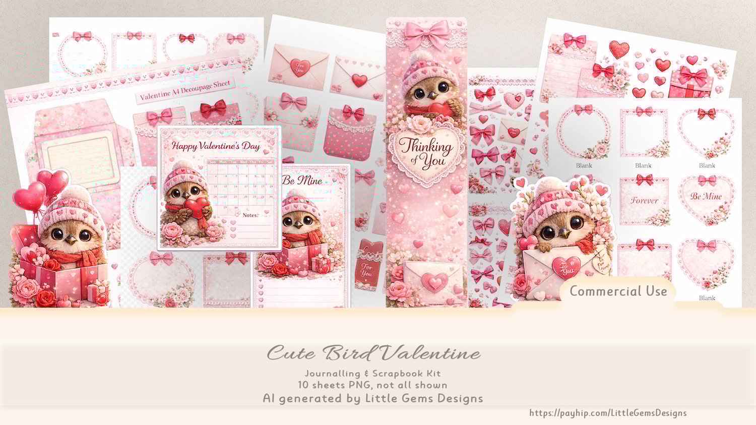 The kit features a sweet and cozy aesthetic with pink tones, hearts, bows, flowers, and a cute little bird as the main character. Ideal for love-themed, dreamy, and charming designs.