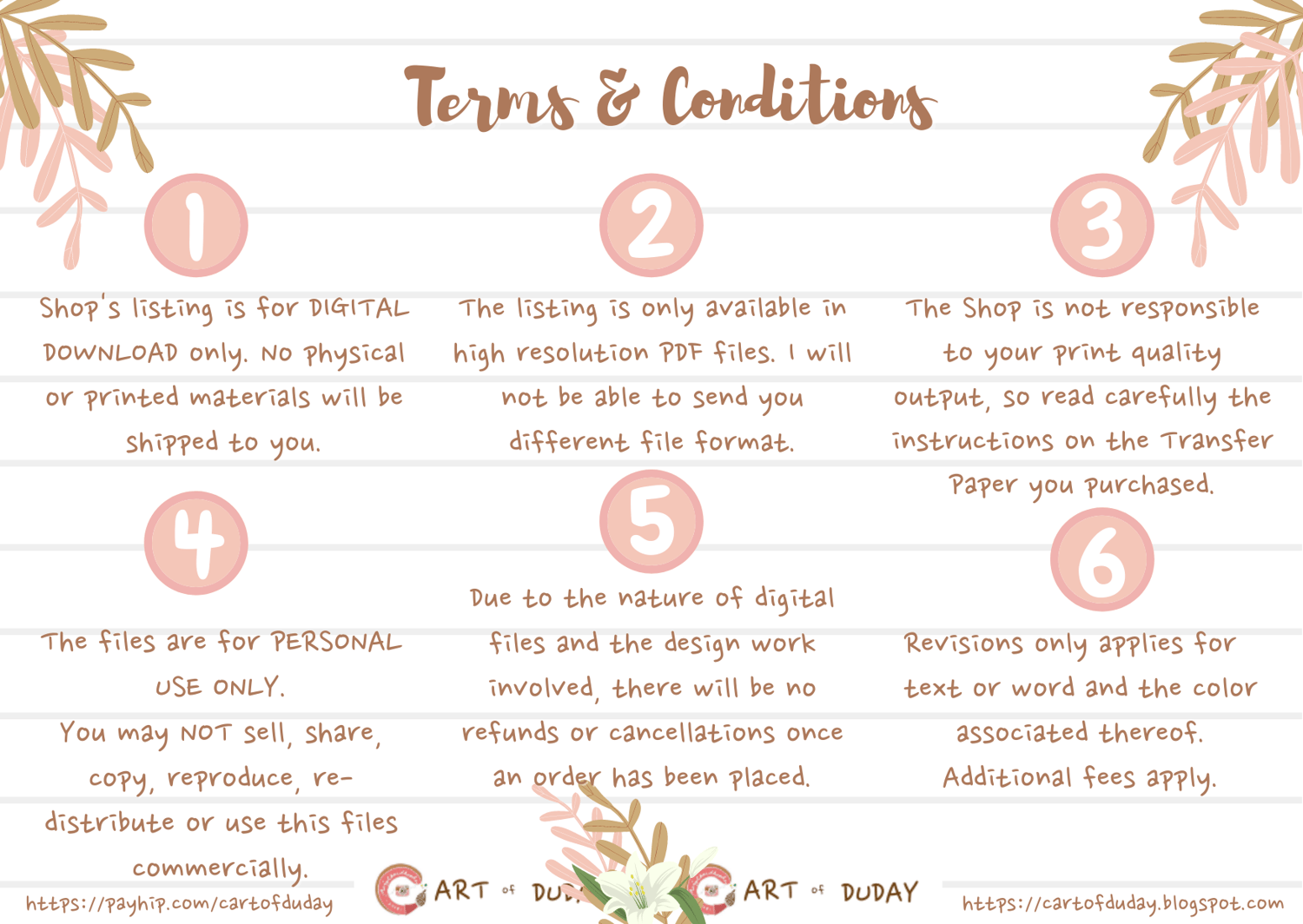 Please let me know if you have any questions. I also accept commission designs for your personal or business use, just drop me a message. I’ll be glad to be of help! 😊