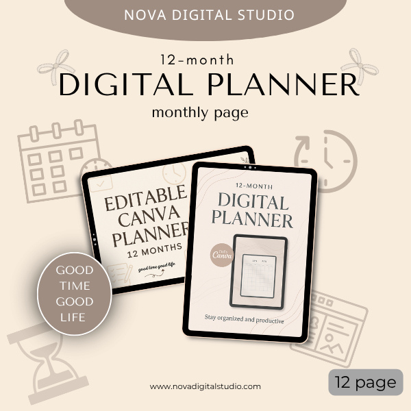 🗓️ 12-Month Digital Time Planner – Fully Editable on Canva💪