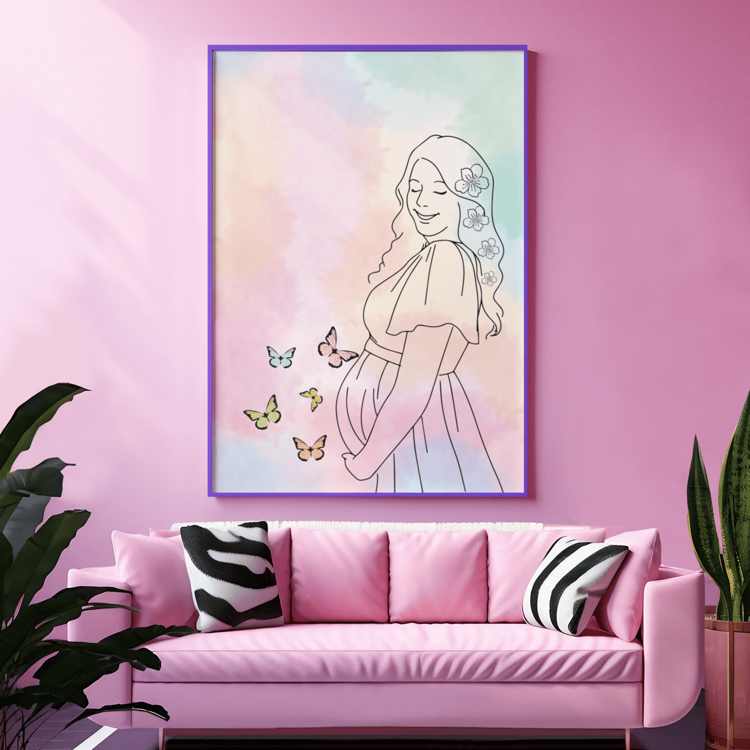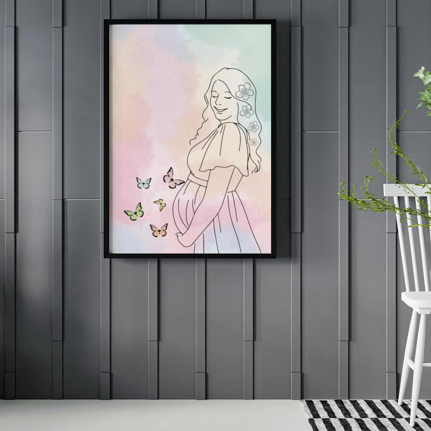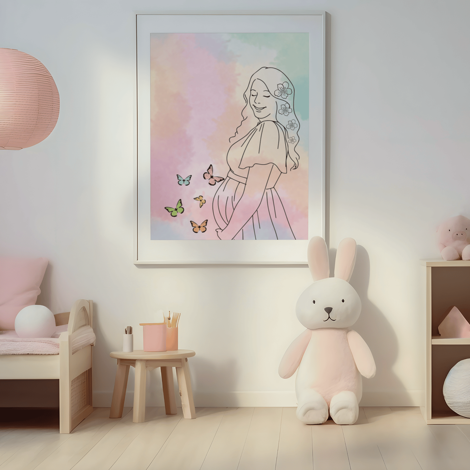 This beautiful pregnant woman illustration wall art celebrates motherhood, love, and the journey of pregnancy. Designed in soft pastel colors with delicate details, this printable artwork is perfect for: