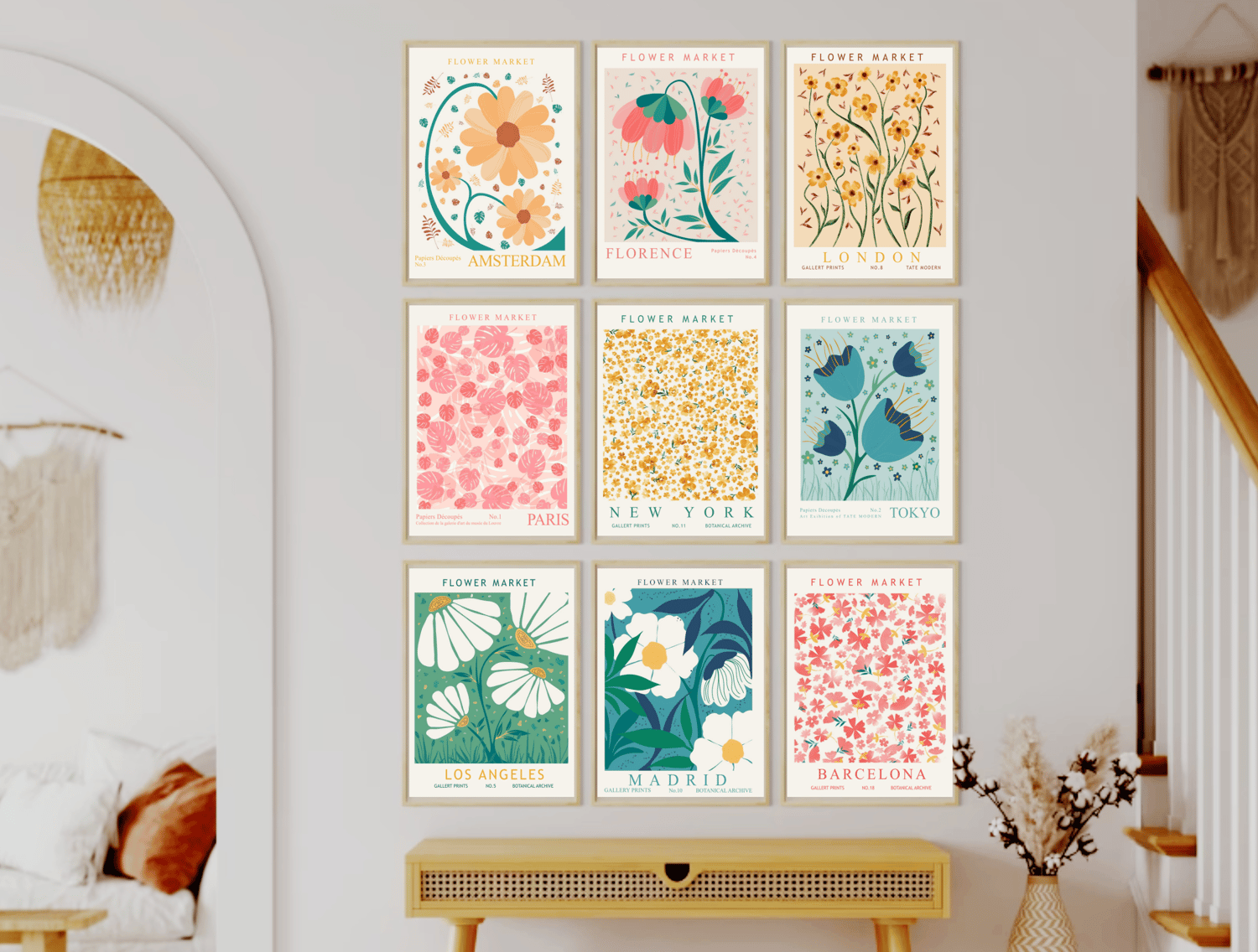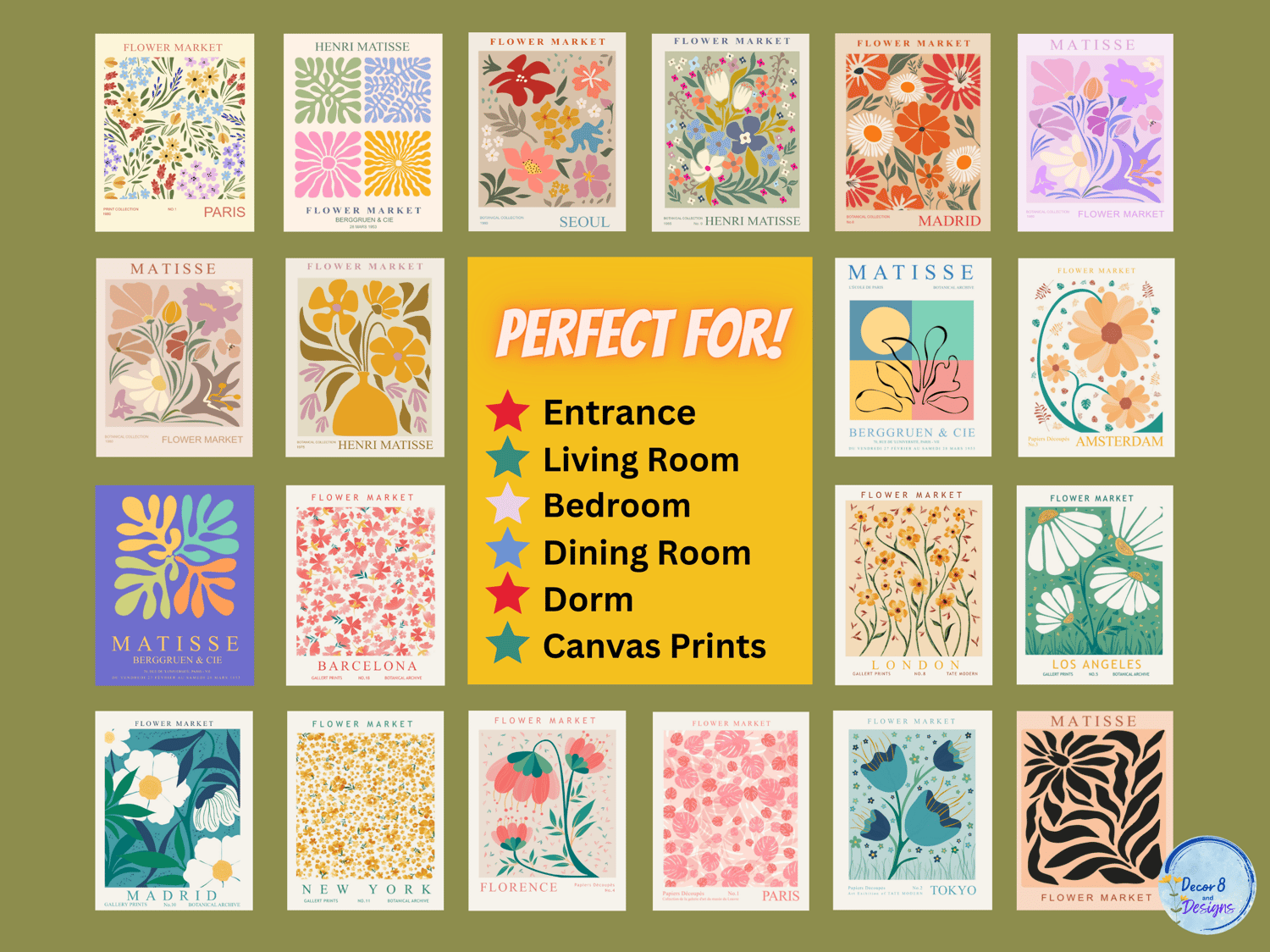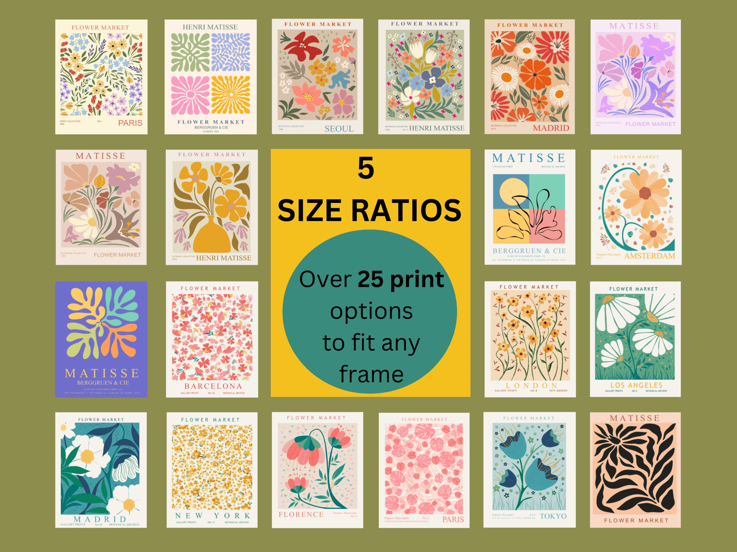 20 best Matisse Flower Market prints in a burst of color for any room in any home or a perfect gift idea. Choose whichever piece you want from this tidy gallery set, and keep them all for years to come, print as needed. The PDF link purchased will take you to a Google Drive folder where you can download any and all 20 files. Each file is created in 5 different size ratios for printing, to fit your ideal frame.
