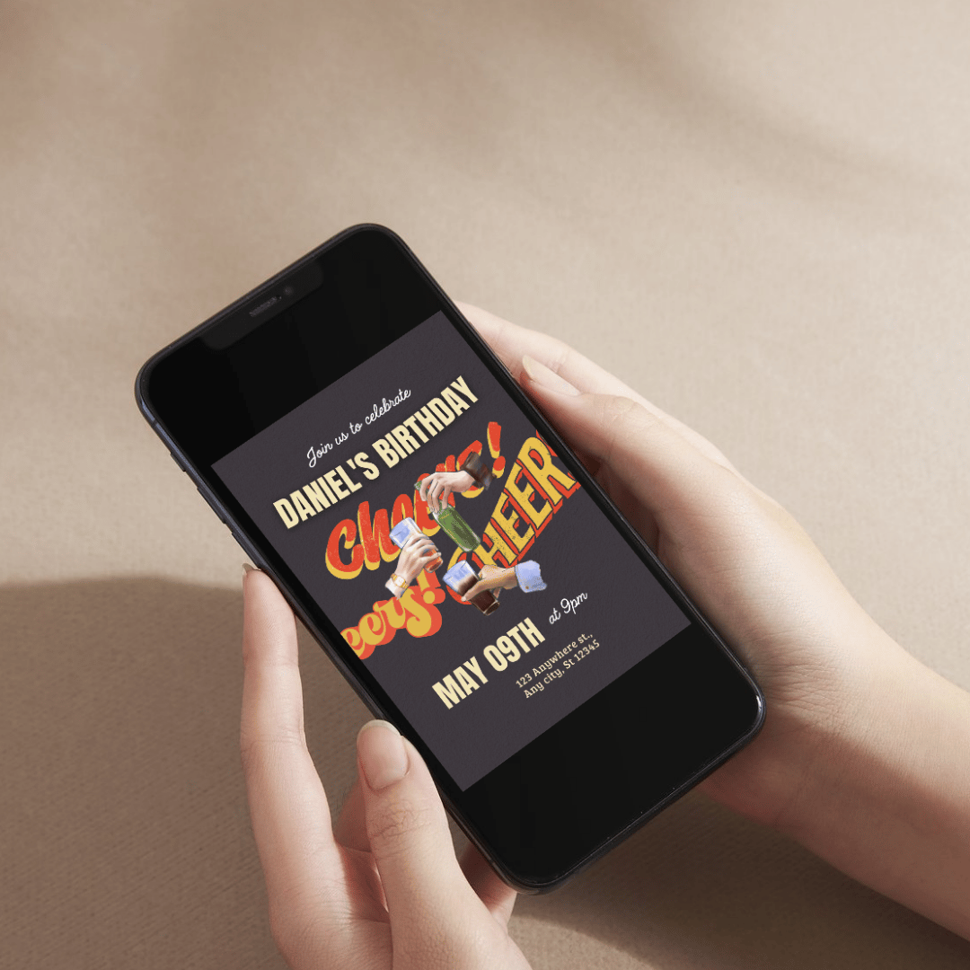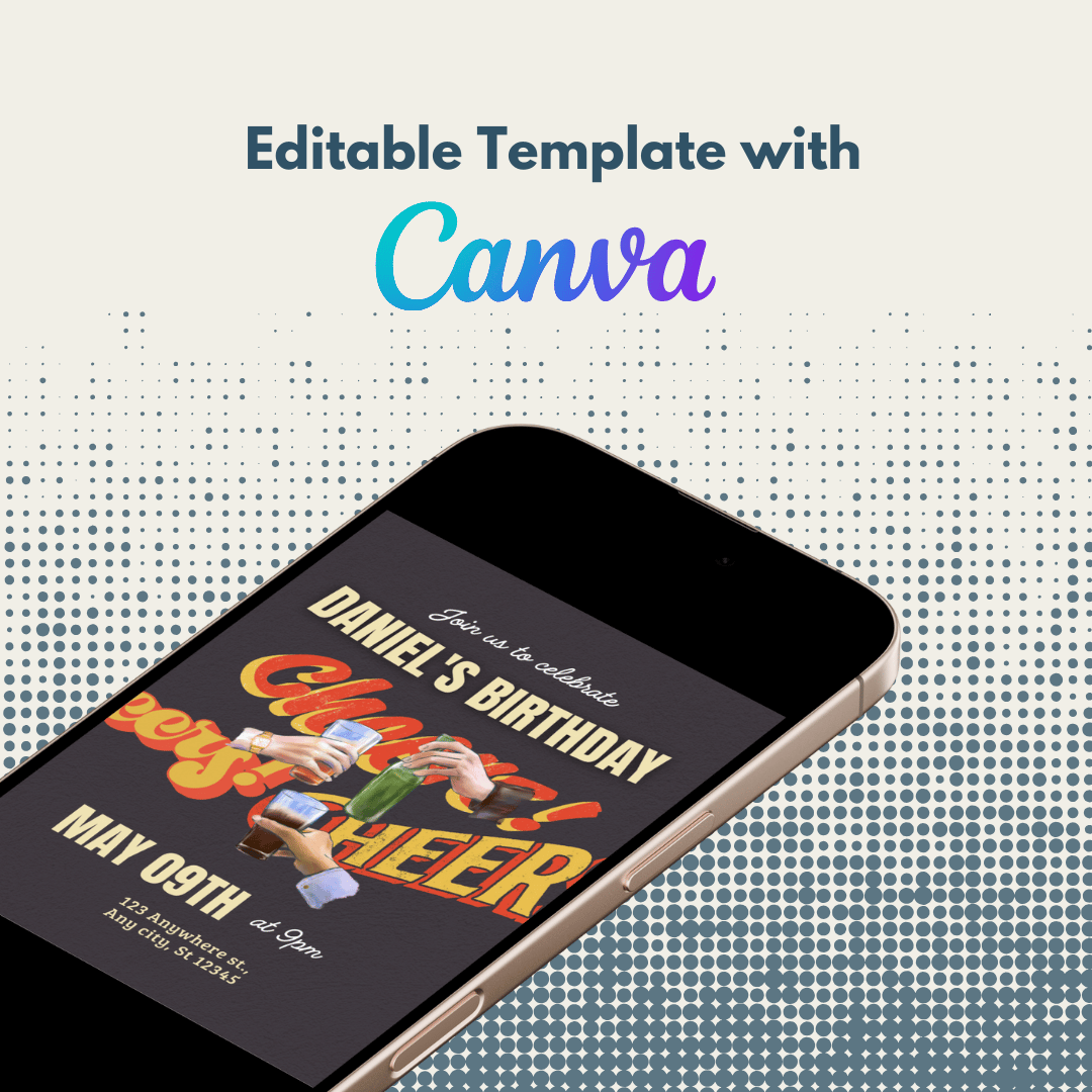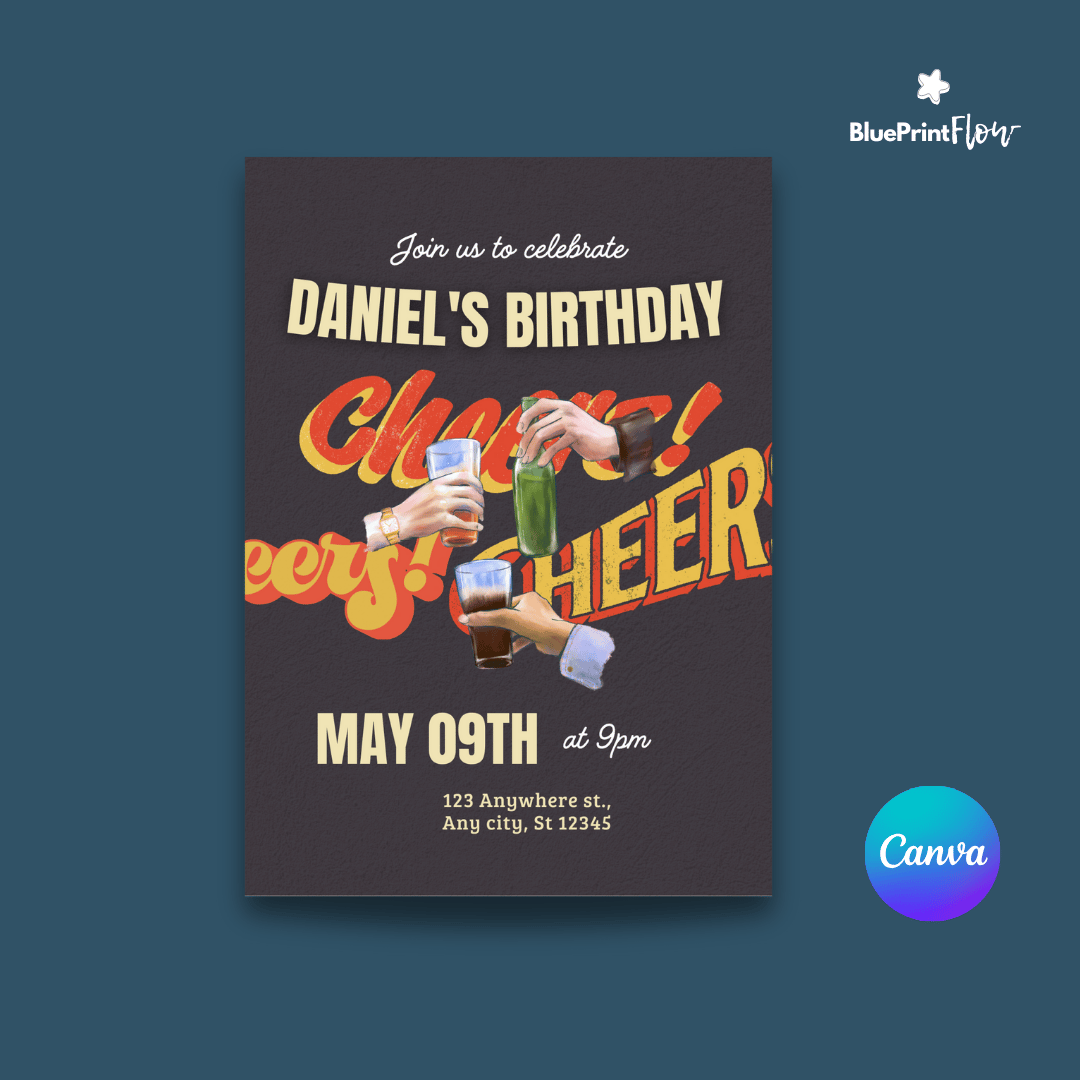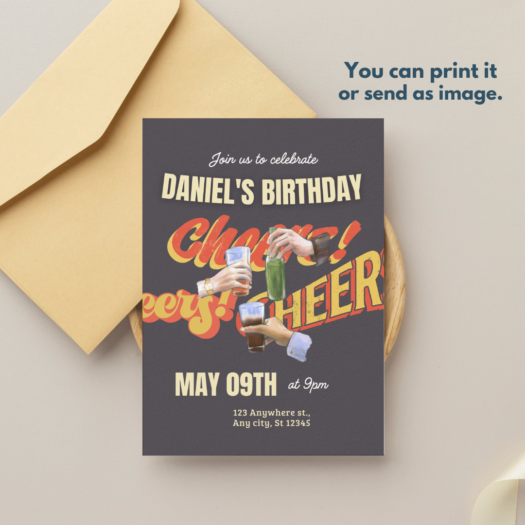 Designed to bring a fun and festive vibe, this editable and printable Canva template is perfect for inviting your friends and family to a special gathering. With vibrant cheers illustrations, bold typography, and a joyful layout, this birthday party invitation sets the perfect tone for a night full of laughter and celebration.