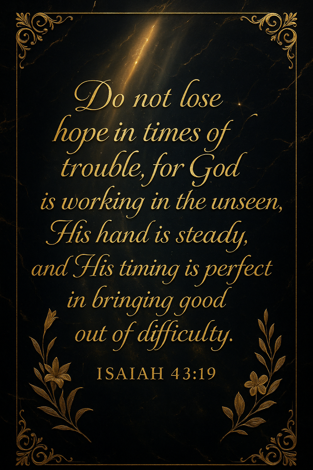 - Inspirational quote: “Do not lose hope in times of trouble, for God is working in the unseen, His hand is steady, and His timing is perfect in bringing good out of difficulty.” – Isaiah 43:19