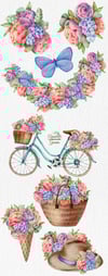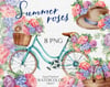 Summer mood, vacation theme. Compositions with flower garlands and bouquets. Retro bicycle, wide-brimmed hat, light blue butterfly, ice-cream cone, blue and pink flowers, basket