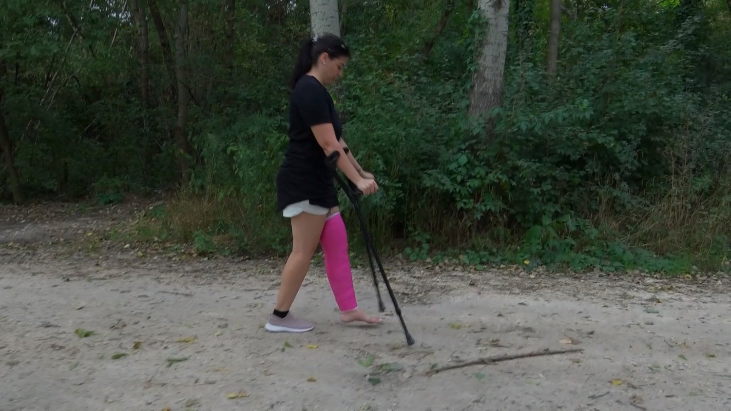 Timmi is casted in a pink cute cylinder cast on her left foot in this great clip, she’s crutching slowly into the overgrown park, it looks very uncomfortable to lift up the straight cylinder cast like that. She has to put her foot down on the dirty road every once in a while, as she crutches Timmi mostly looks down to the ground to keep herself focused. Sometimes she looks up as well to enjoy the view of the green environment around her. It sure is a challenge but now she spots a bench not far away! She set course towards that bench immediately and crutches almost carelessly across the grass to get there. Watch her bare foot resting on the bench as she wiggles with her toes in an extreme closeup for the camera, sit back and watch as the great closeup continues until the very end of the clip.