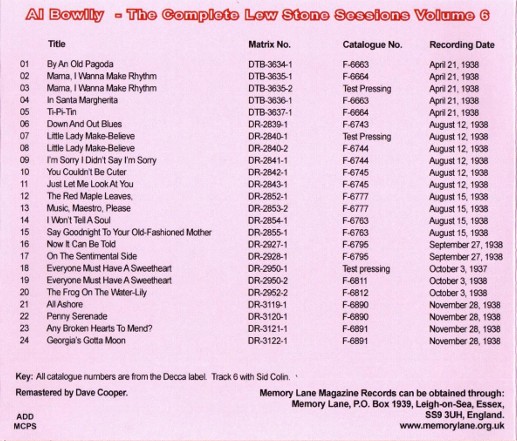 The sixth and final release of Lew Stone and Al Bowlly recordings to complete the set. Look out for a few new finds by Lew Stone and Bowlly in later releases, that weren't available when this set was produced. There are a number of rare alternate takes included here.
