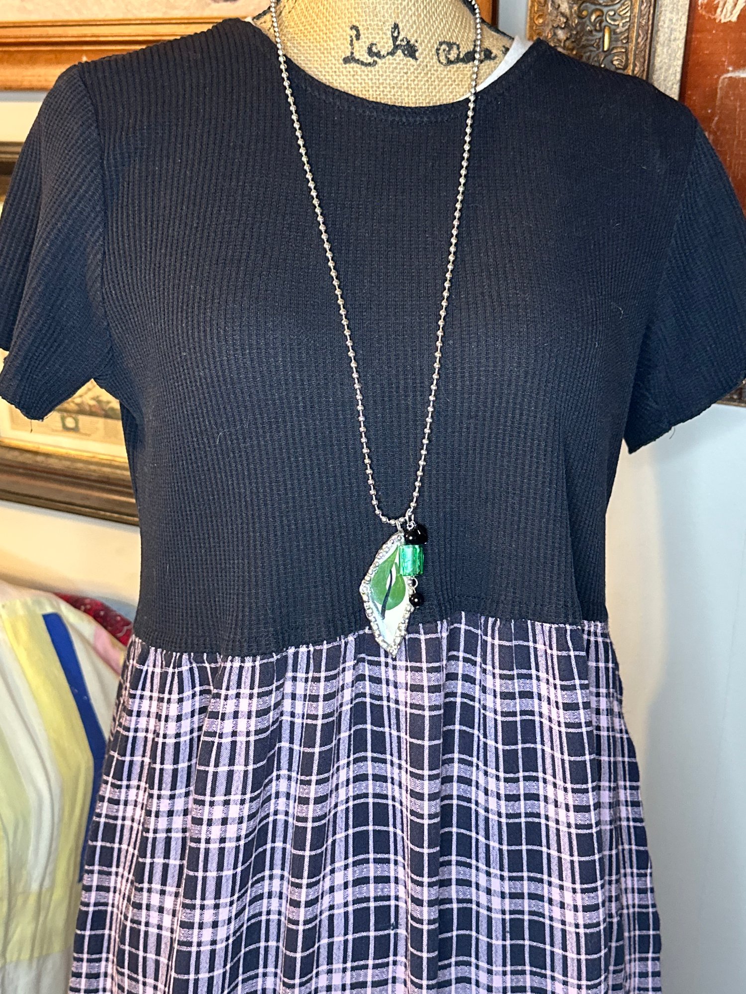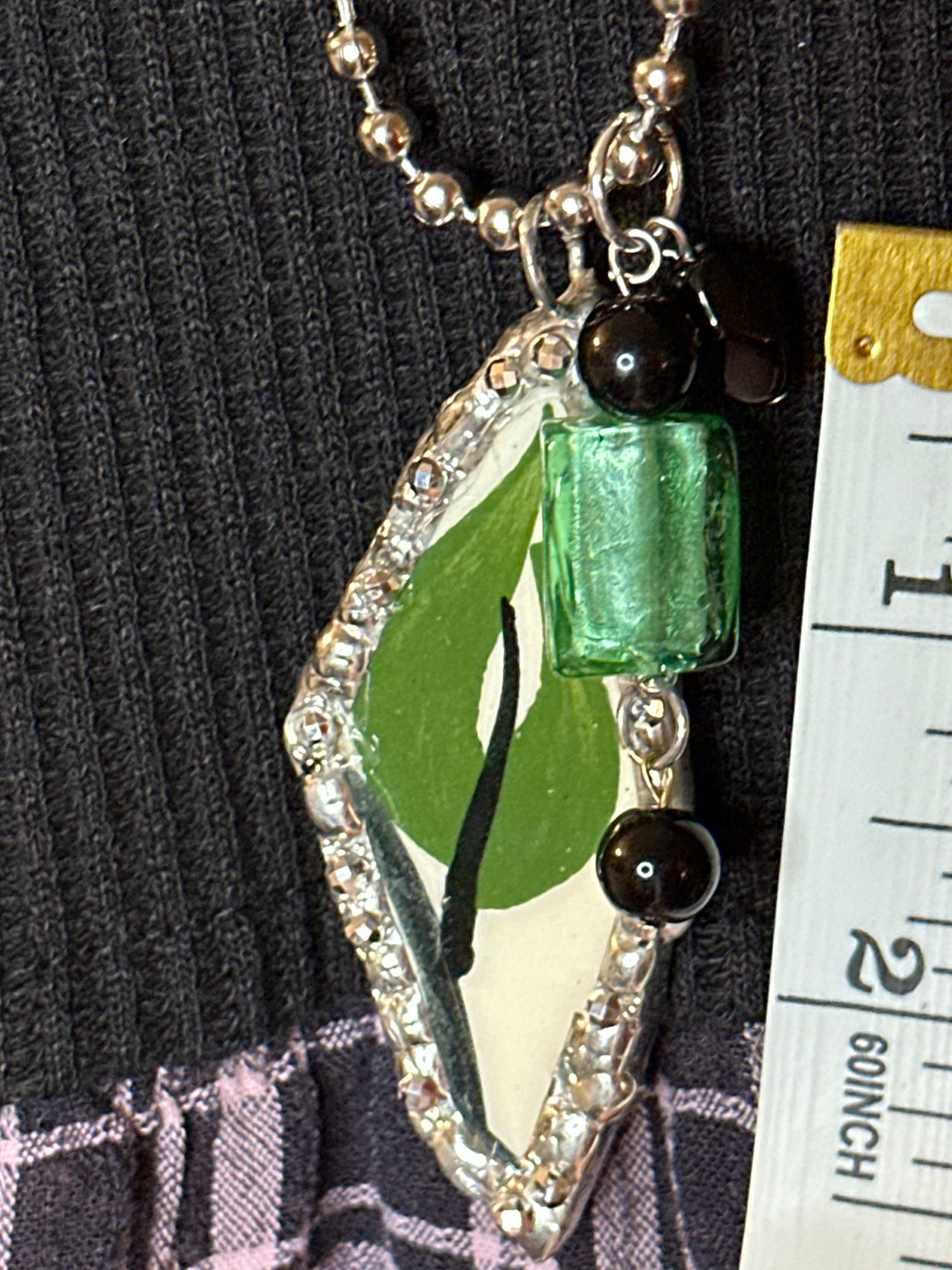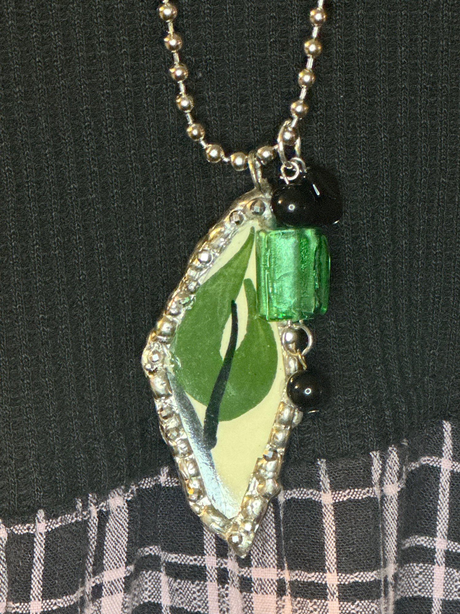 This bold pendant necklace is made from a hand-cut shard of vintage china featuring a striking green leaf design with deep black accents. The diamond-shaped shard is framed in silver solder with faceted edging for a touch of sparkle. Finished with a large emerald-green glass bead, black stone accents, and a silver-tone ball chain, this necklace is a vibrant statement piece that blends nature-inspired style with vintage charm.